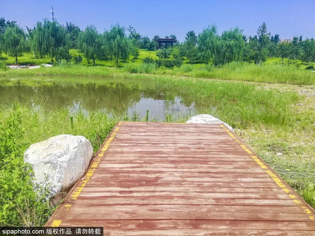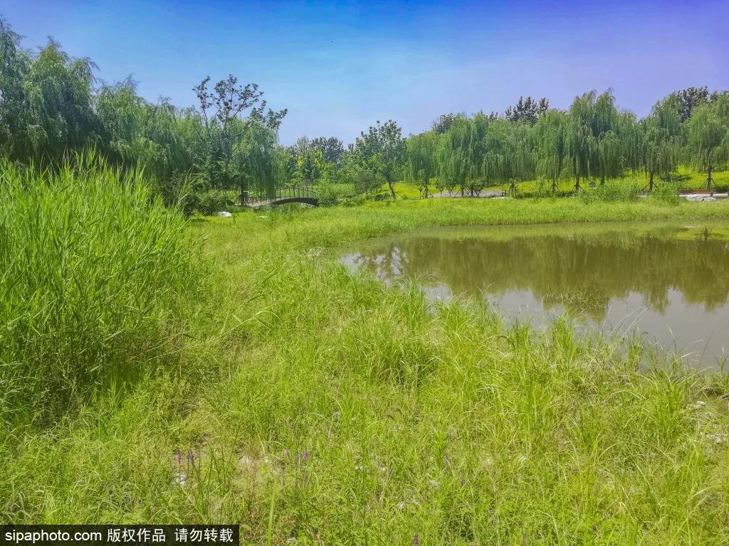 一座小拱桥连接湖两岸,岸边绿树成荫,湖上芦苇青青。