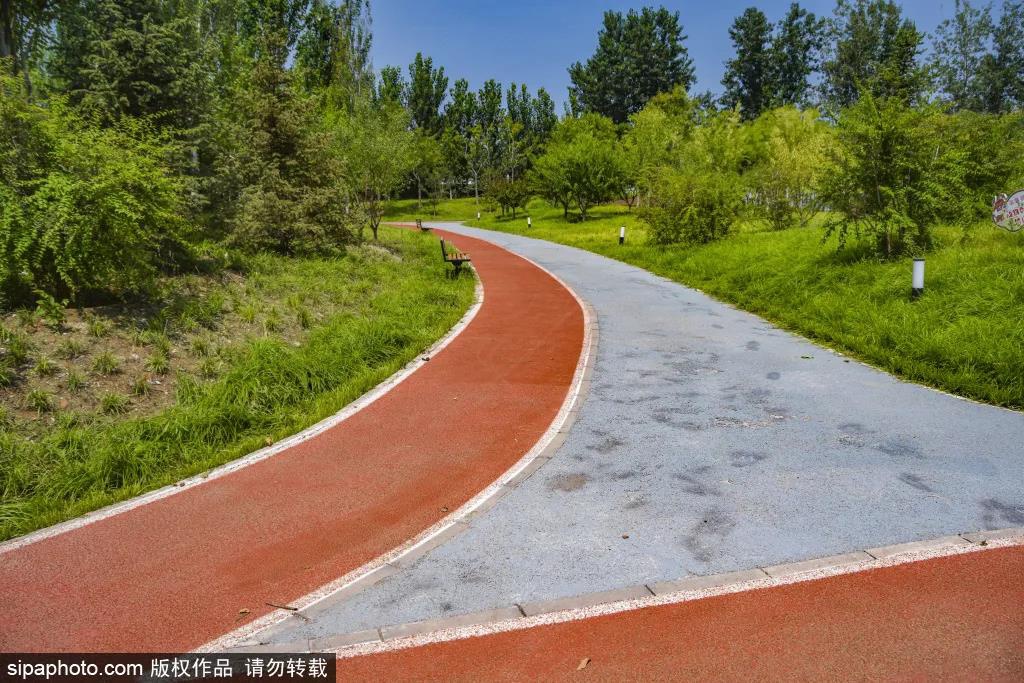 主环路内侧设置了宽1.5米、全长1公里的慢跑道,红色的是崭新柔软的塑胶跑道,灰色的是平整坚硬的石子路。