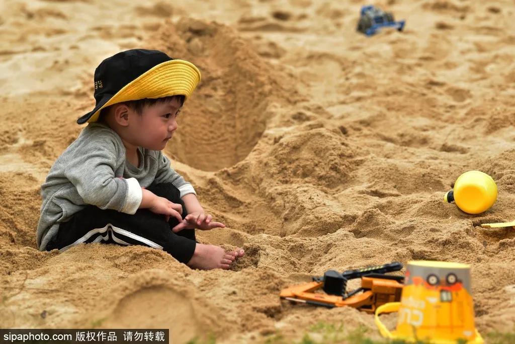 鸭舍的不远处,有一块游乐场所,沙子围成的沙滩,是小朋友们的乐园。
