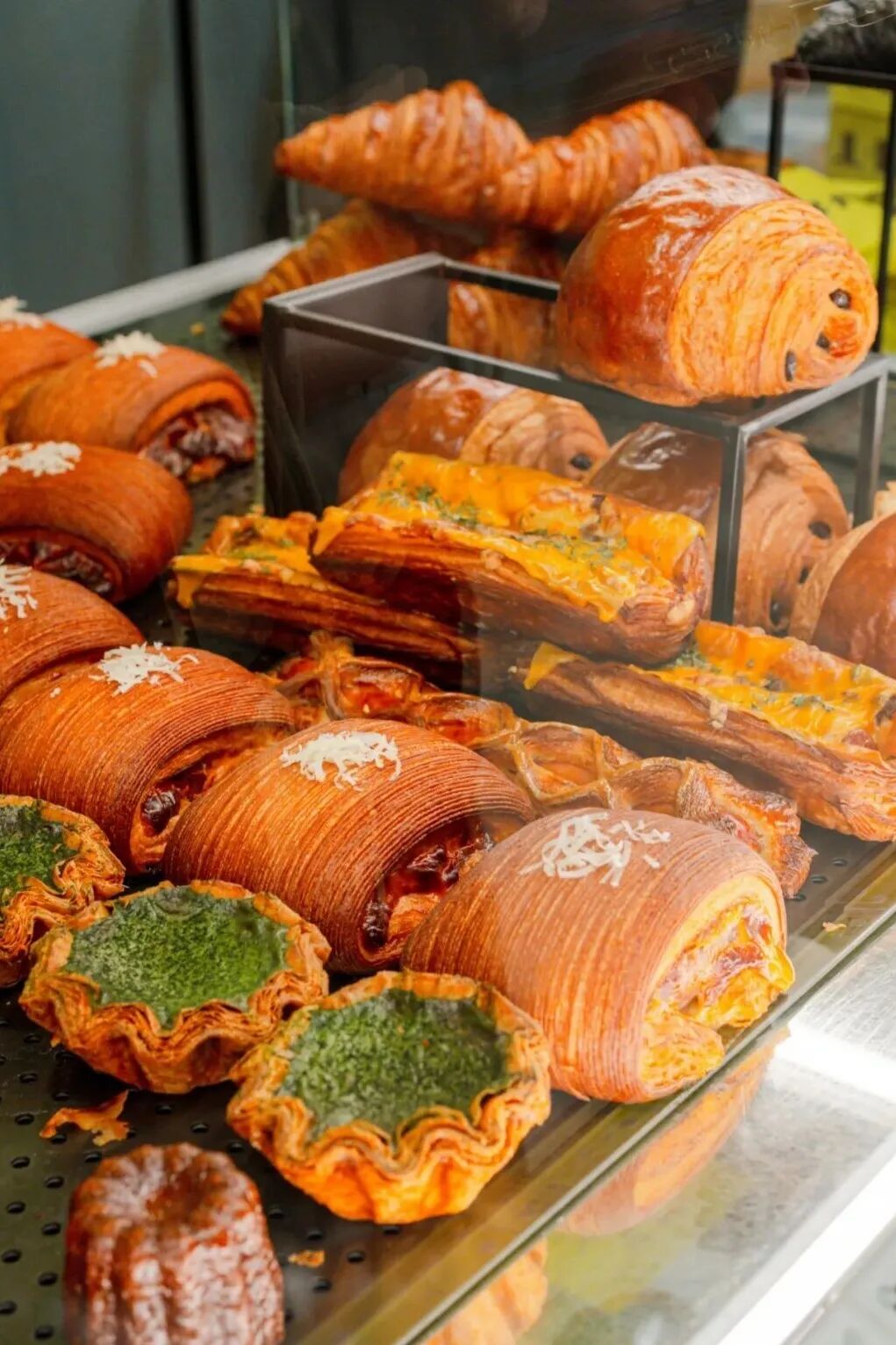 使用康普茶天然酵母制作面包的“T-FOUR”,柜台摆放着不同风味的罐子。店面不算很大,但面包品类很多,起酥类的面包更是深受好评,整形漂亮,开酥也均匀有香气。店内也有歌剧院等甜品可以选择,还会根据时令推出季节限定,时不时来逛都会有惊喜,买来当早餐或者下午茶都很合适。
