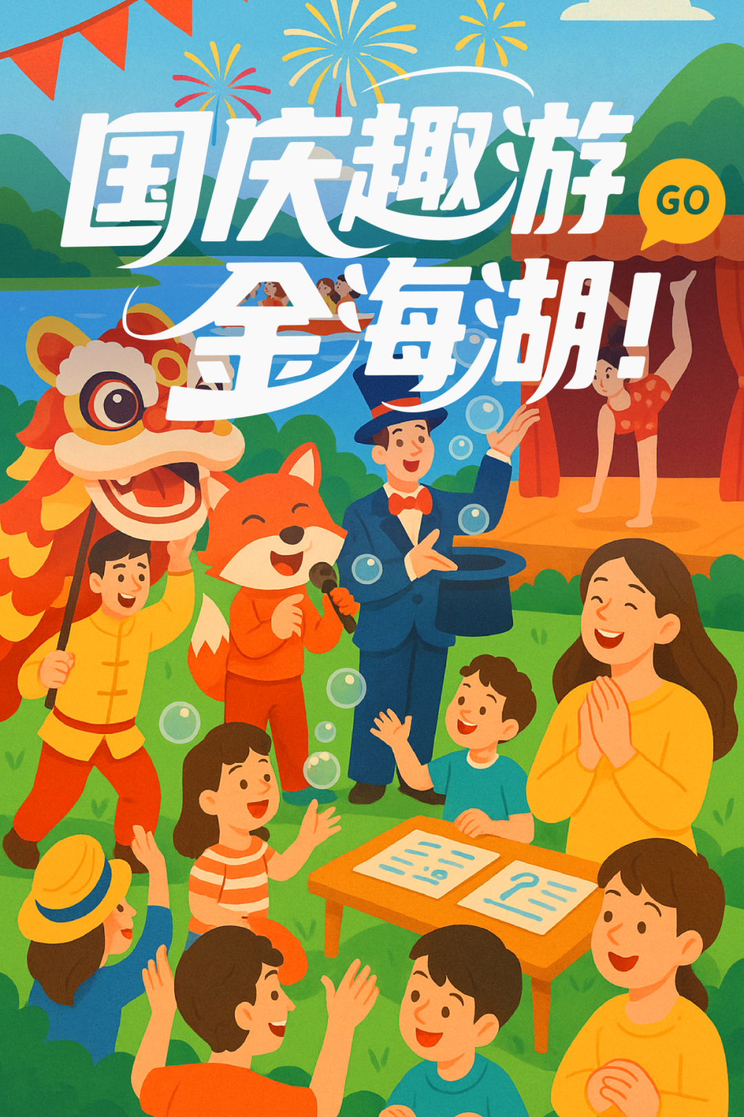 10月1日至10月8日每天10:00-11:00,景区特别邀请专业演出团队,带来互动式主题巡游,与游客挥手互动、传递节日祝福。巡游过后,固定舞台区更有舞狮、魔术秀、杂技、泡泡秀等精彩演出。