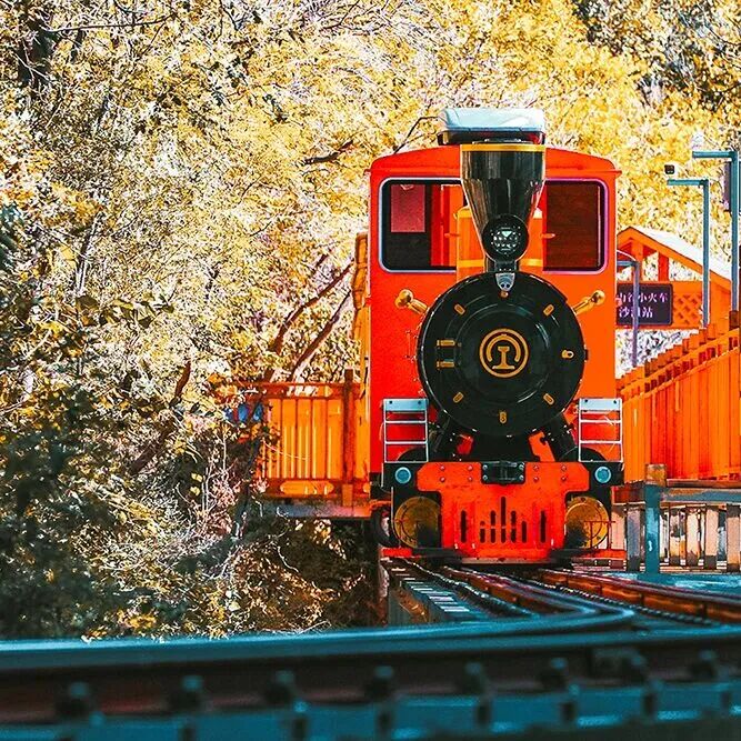 山谷小火车穿梭于层林之间,窗外橙红金黄的叶片,仿佛触手可及。