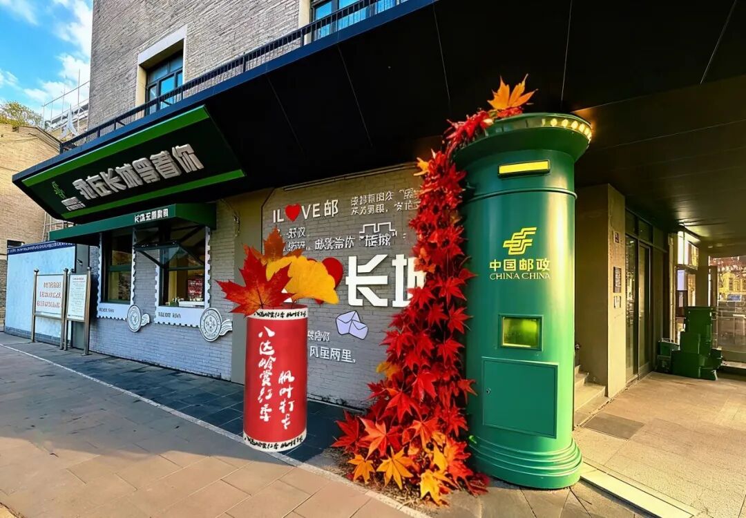 邮局边上复古邮筒与红叶装饰相伴,宛如时光寄来的旧信。