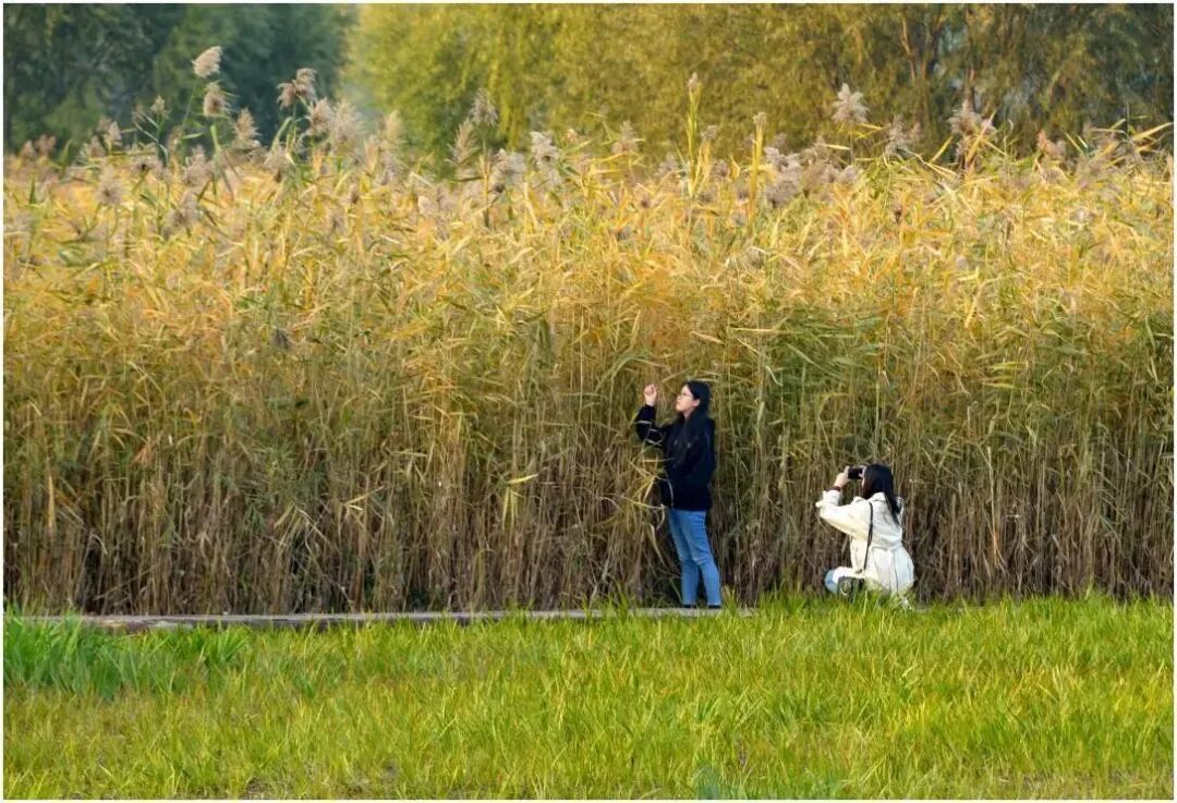 温榆河公园的芦苇与园内建筑景观相得益彰,风起时层层荡漾,芦苇荡如金色的波浪,在阳光下闪烁。