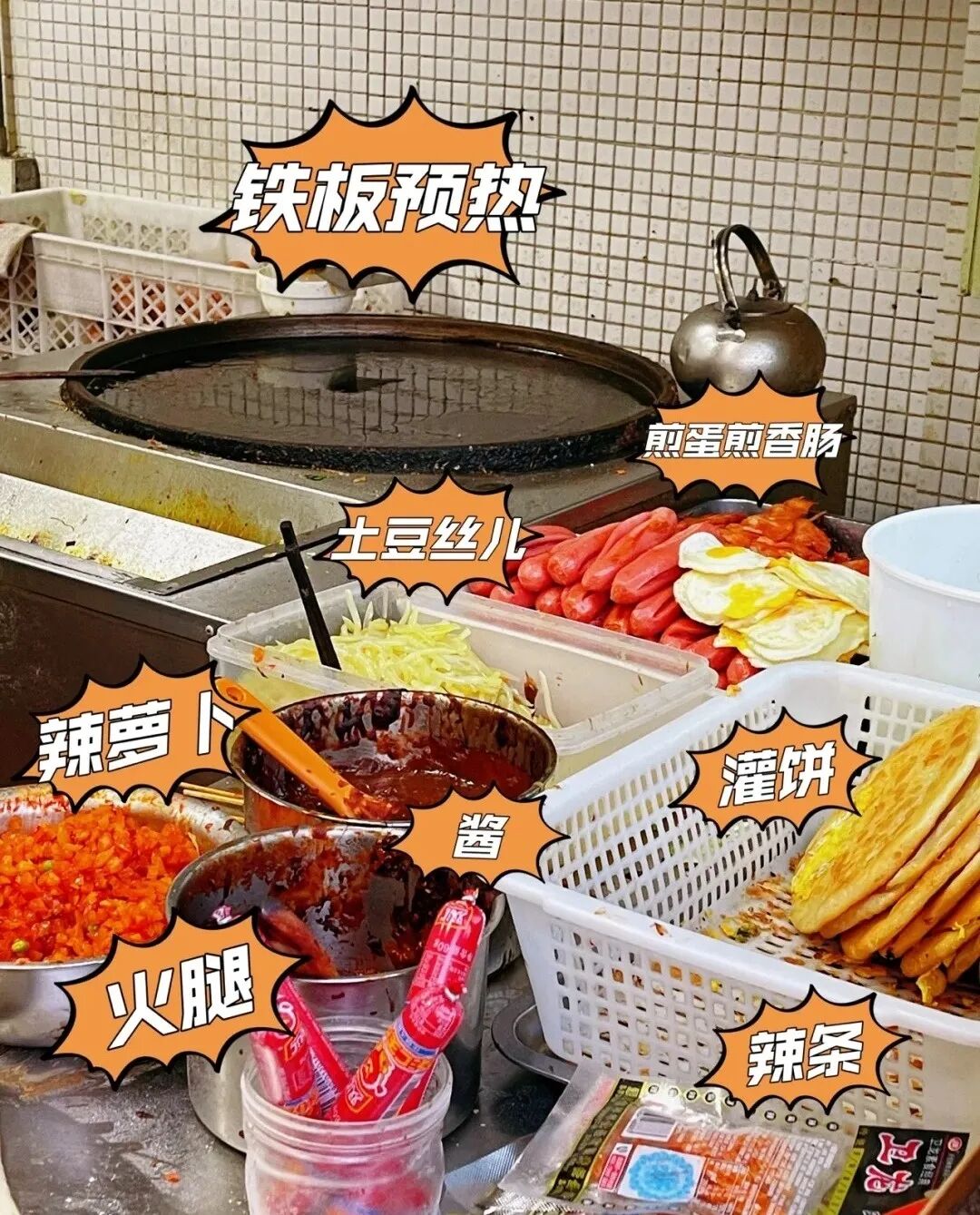 从广渠门内站B口出,网红鸡蛋灌饼店前经常排着长队。店主站在铁板前,手里的铲子上下翻飞,擀好的饼皮放到铁板上,不一会儿就鼓起一个大包。再用铲子在饼皮上戳个洞,麻利地灌进蛋液,然后翻面,刷上甜面酱、辣酱,夹上生菜、薄脆,最后卷起来,装进纸袋里,递给排在最前面的顾客:“小心烫,刚做好的,趁热吃。”