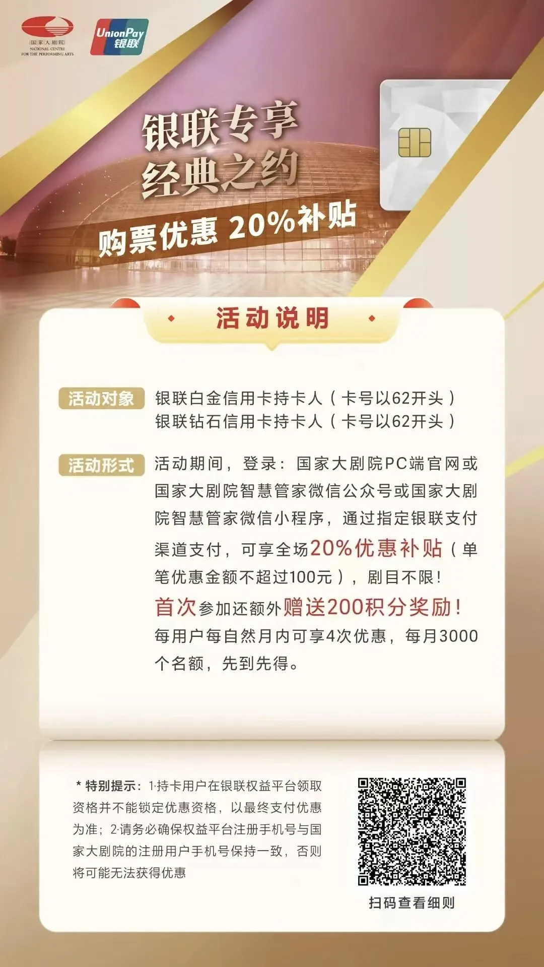 为保障您的权益,请您在以下国家大剧院官方渠道购票:国家大剧院官网、国家大剧院智慧管家微信公众号、国家大剧院智慧管家微信小程序、订票热线66550000、国家大剧院和北京艺术中心售票处现场、官方授权票务代理机构大麦网、猫眼演出、大眼睛票务、保利票务。