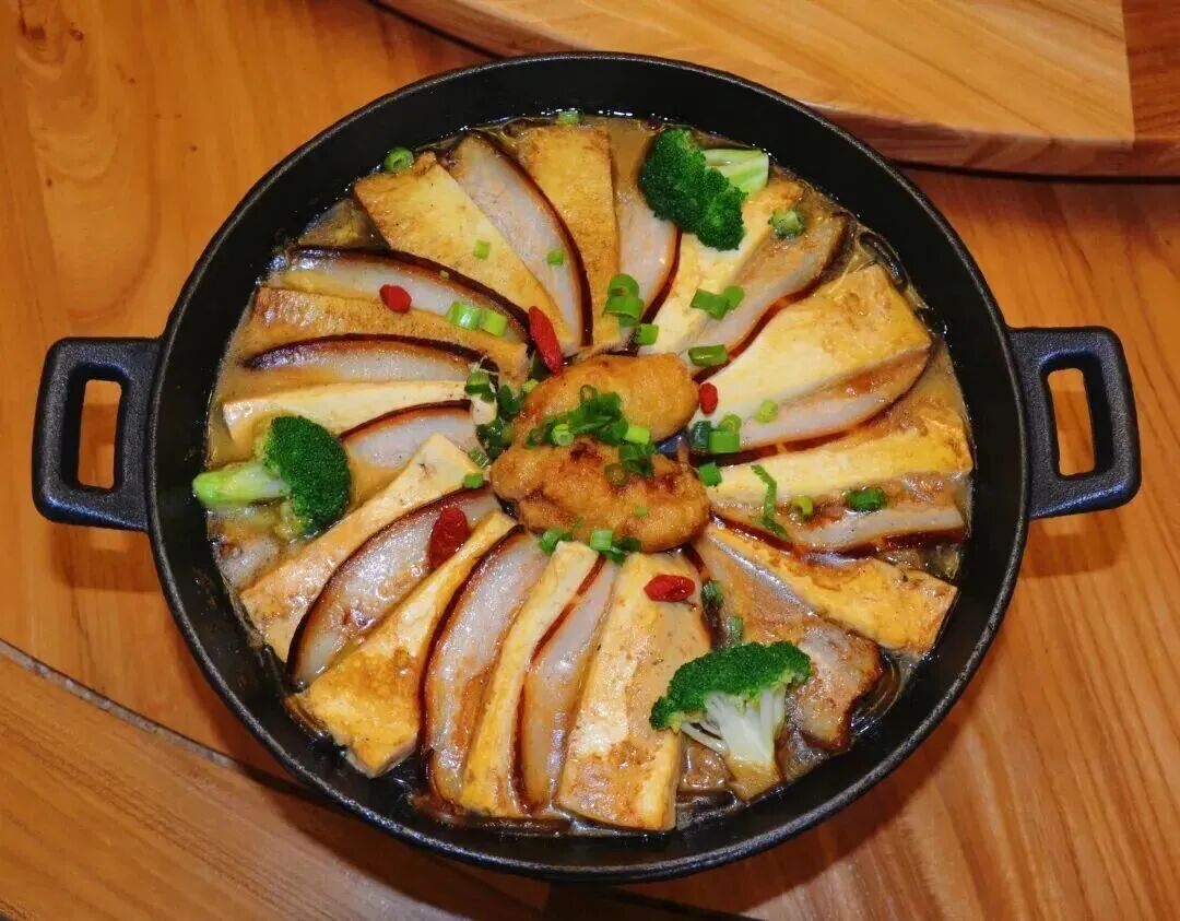 传统火盆上放上砂锅加以白菜、豆腐、五花熏肉等食材,配上美容养颜的黄豆豆腐、滋补养肾的黑豆豆腐、清热袪火的绿豆豆腐。