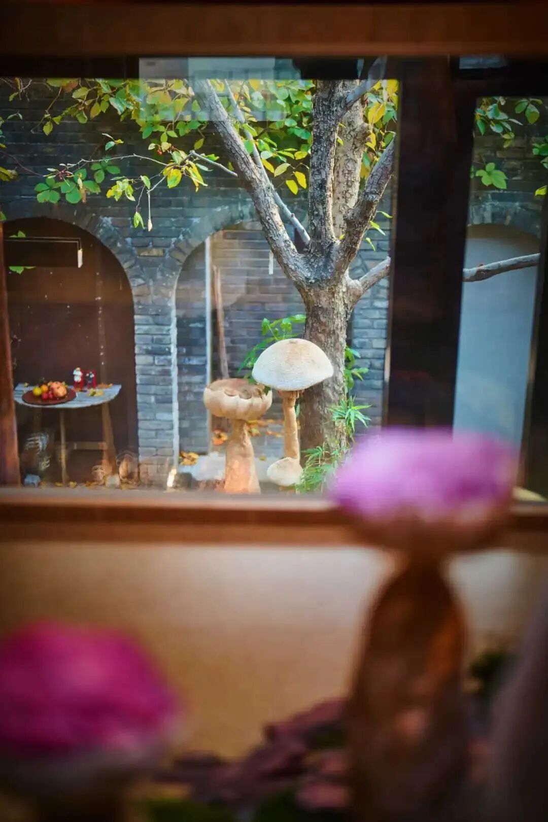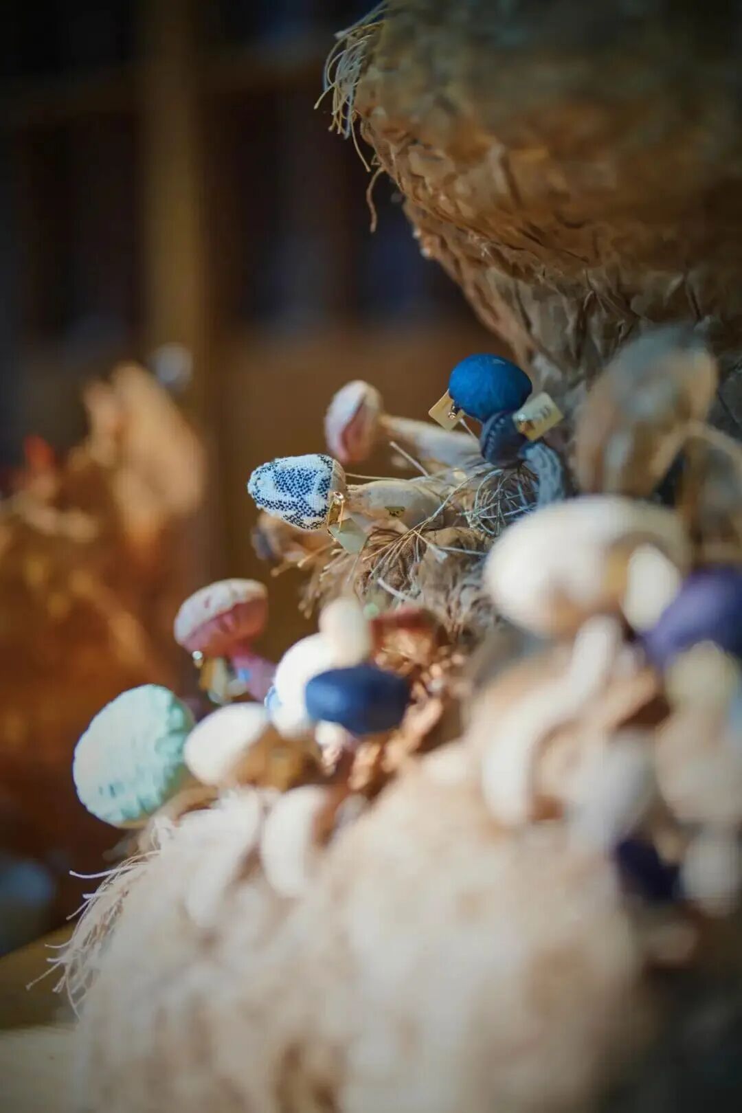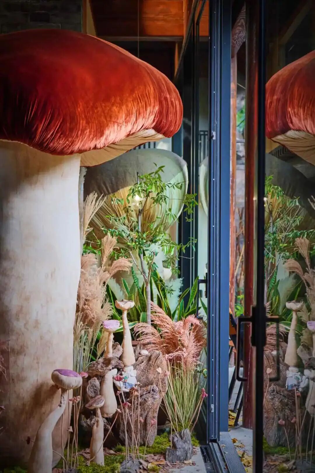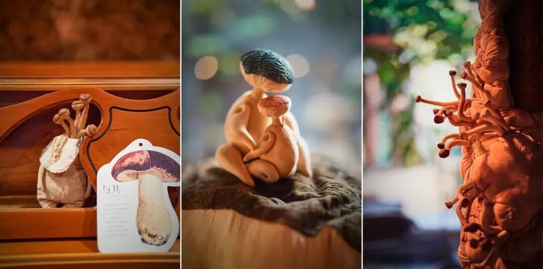 这里有两米多高的巨型“菌菇”,也有手指大小的几株被嵌入画框,像会呼吸的标本画。大大小小的“蘑菇”丛丛簇簇,依偎在海棠树下、停驻在房梁木上、静立在落地窗边……构筑出一个童话般的“共生”世界。