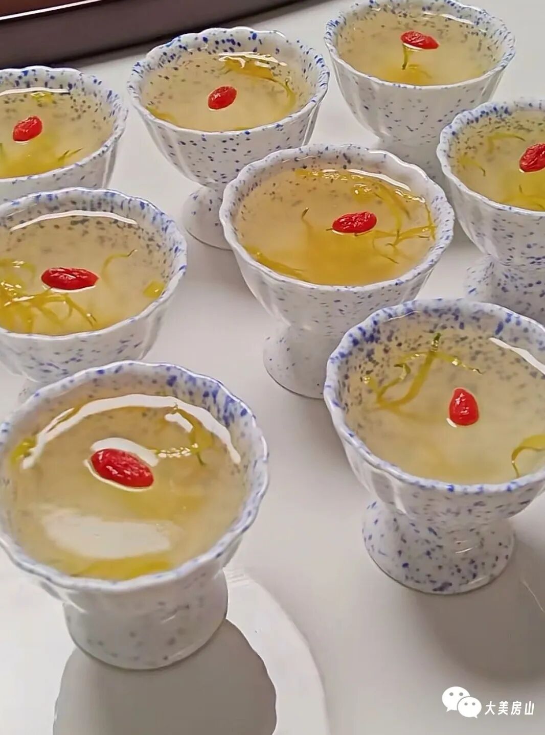 菊园人气甜点非菊韵果冻莫属,新鲜菊花榨汁后与果冻液融合,凝制成晶莹剔透的果冻。入口Q弹爽滑,带着自然的菊香与微微清甜,还能看到细碎的菊花花瓣。