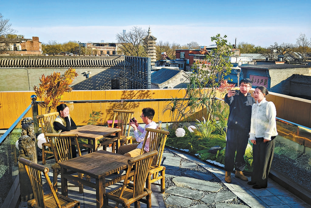 开业首日,客人已然不少。一些年轻人结伴走上三层的露台,欣赏午后砖塔胡同的景色,在店里店外集齐九宫格。