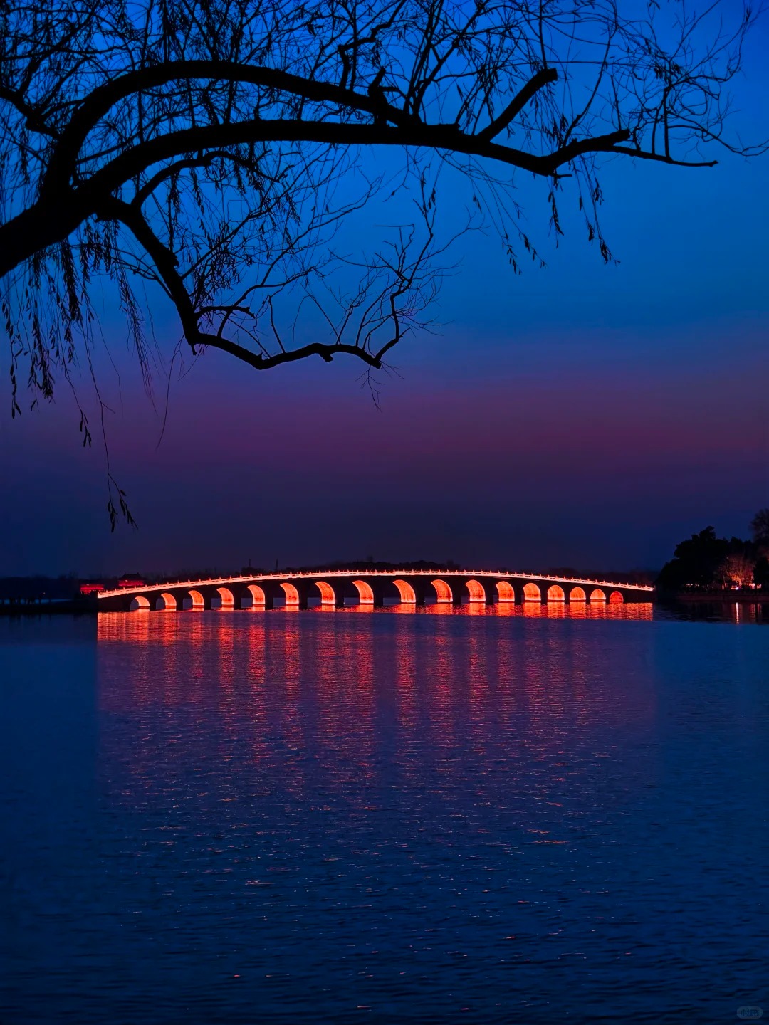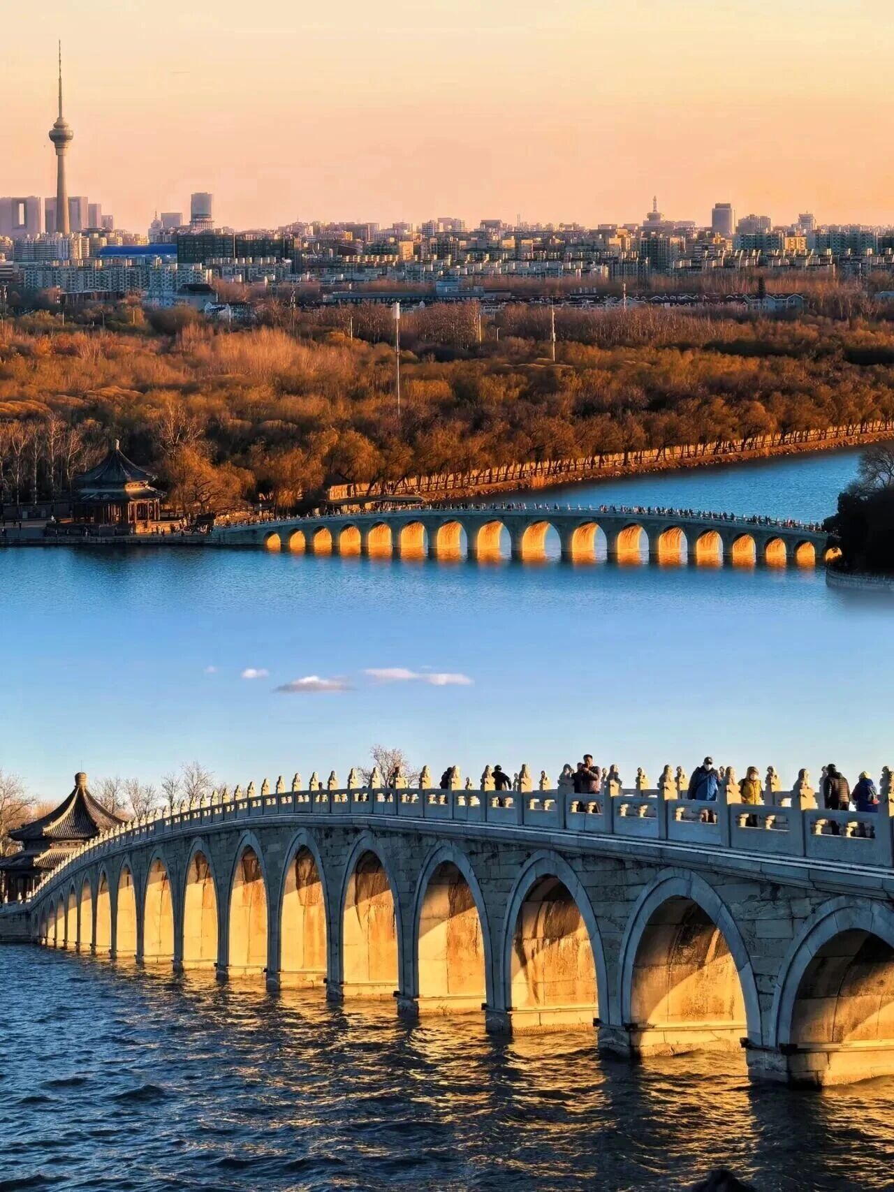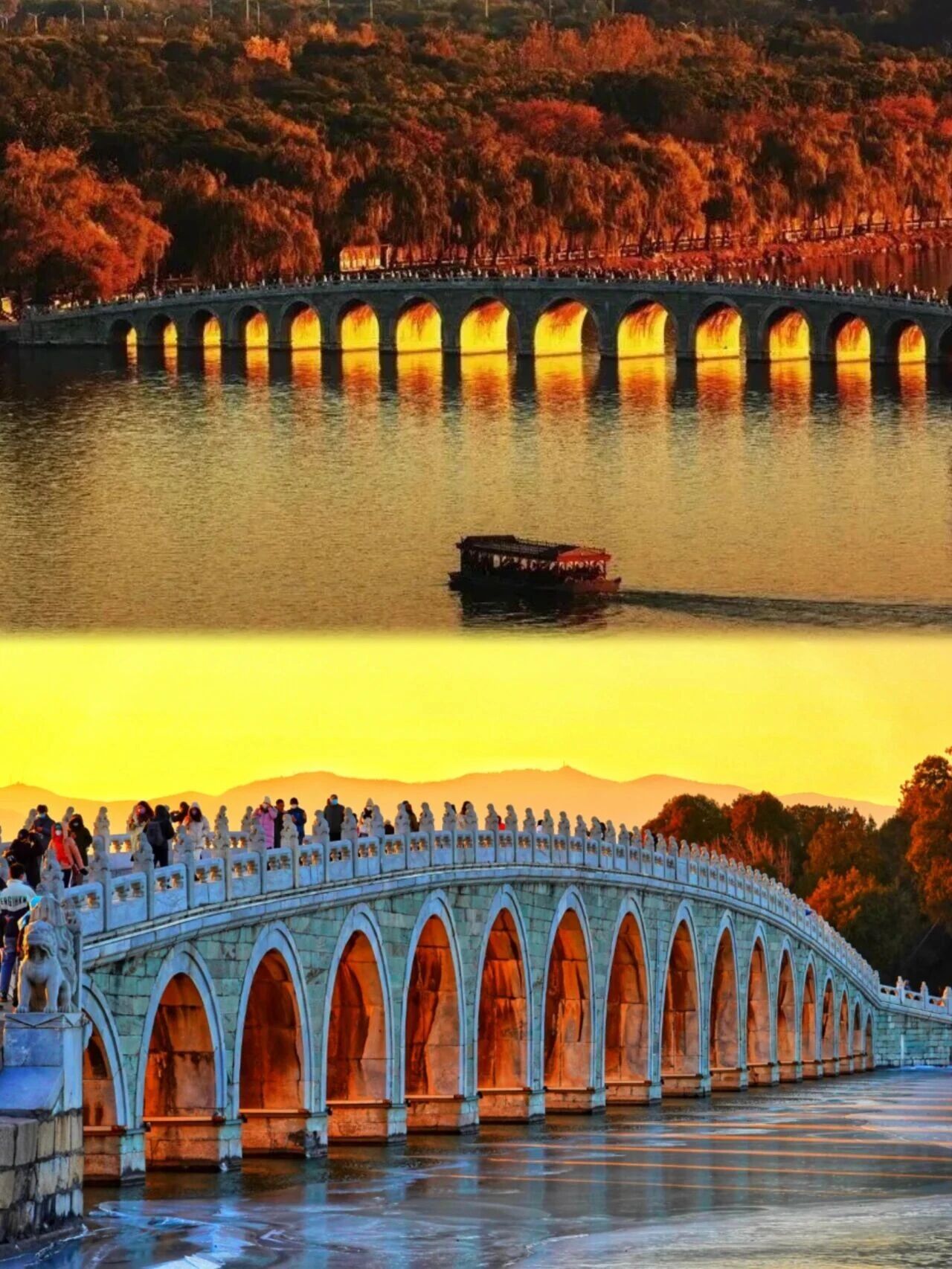 十七孔桥的十七个桥洞会被余晖逐一染金