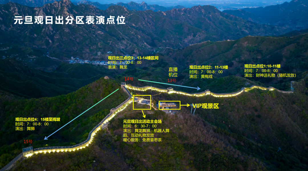 酒店推荐四大宝藏点位——缆车上站平台赏金鳞柔光、12-13号敌楼拍人与朝阳同框、15号敌楼复刻《非诚勿扰》浪漫、10-11号敌楼偶遇财神送福;