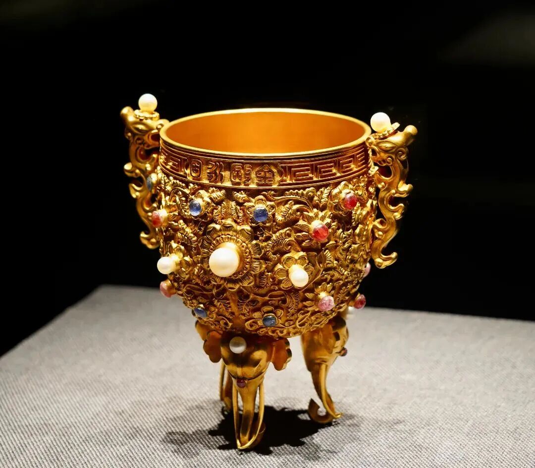 108件(套)海昏侯墓文物展品重磅亮相,展厅内“金锡之贡”单元尤为亮眼,纯度高达99%的褭蹏金(马蹄金)、麟趾金、饼金整齐陈列,底部“上”“中”“下”的铭文清晰可辨,精湛的花丝镶嵌工艺尽显汉代工匠技艺的高超。