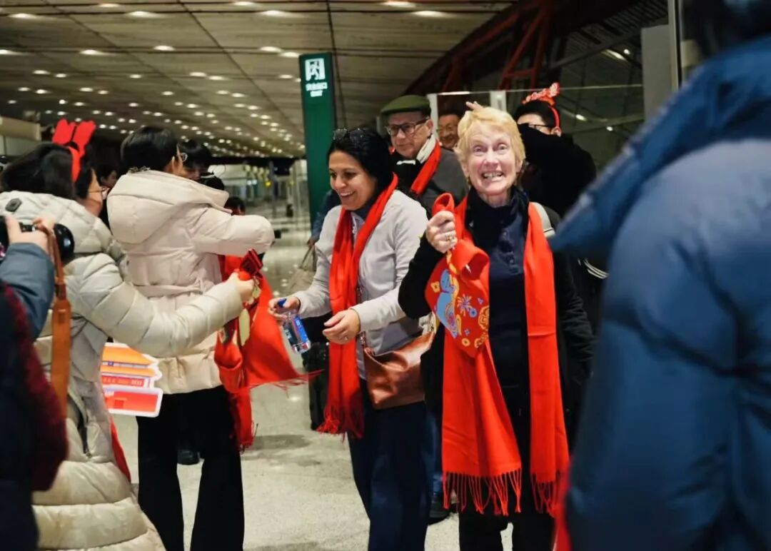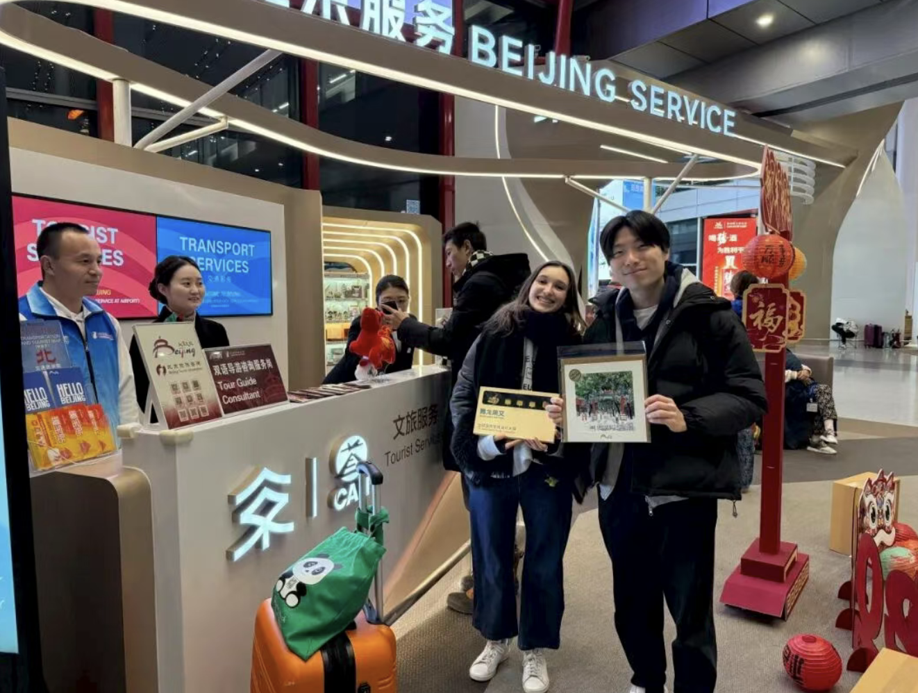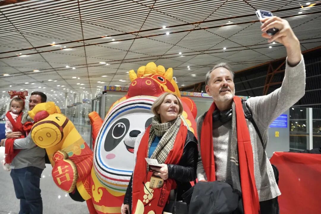 一出舱门,游客们就被憨态可掬的“北京礼物”马墩墩人偶吸引,争相合影留念。“我之前在这里生活学习过,很有感情,所以看到有合适的航班,我就买了来北京的机票,很期待此次中国之行”德国游客Moriz难掩兴奋。来自北京的欢迎仪式与伴手礼,更让他切实体会到这座城市的温暖。北京市文化和旅游局特别为游客送上寓意吉祥的“来京大礼包”,内含“北京新发现”十大冬季冰雪旅游线路、《你好,北京》入境游攻略、《住在北京》酒店手册及离境退税指南,同时整合滴滴出行、携程集团、秀水街等企业专项优惠,全方位丰富游客的北京之旅。