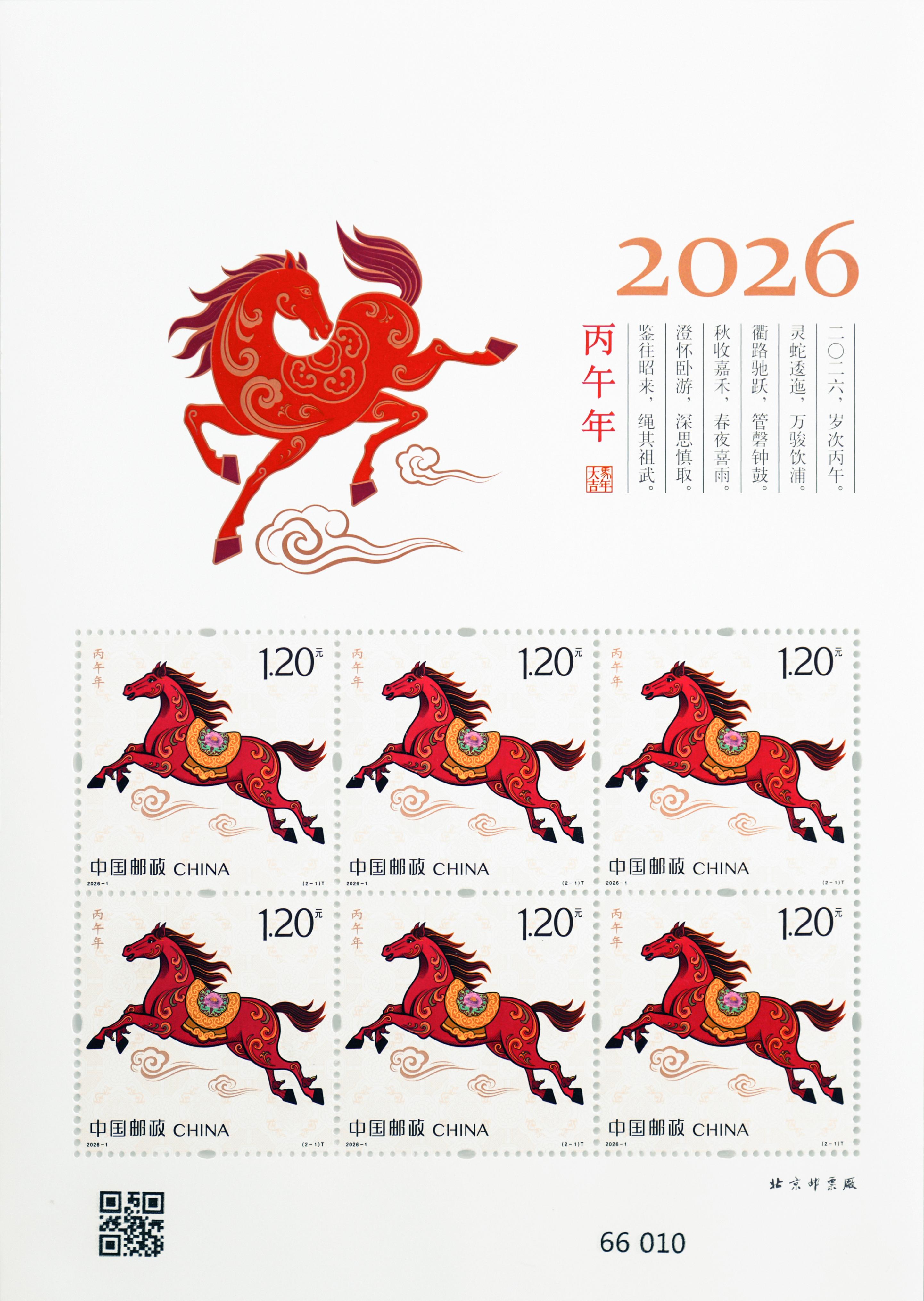 《丙午年》特种邮票全套共2枚,第一枚邮票图案名为“驰跃宏图”,图中红马踏云、鬃毛如焰;第二枚邮票图案名为“万骏臻福”,图中三骏并驰、祥纹环绕。全套邮票面值2.40元,计划发行套票2668万套,版式二162万版,小本票280万本。