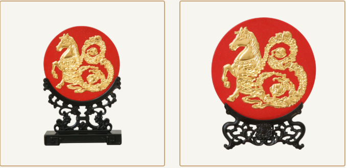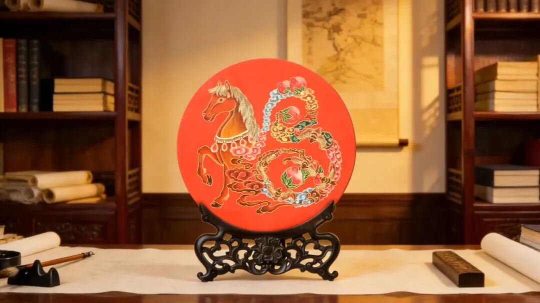 雕填款:于漆面精心雕刻纹路,再以彩漆描绘,金粉戗填。马首轮廓深邃,寿桃丰润立体,在光影流转间呈现细腻的肌理层次。赏盘直径26厘米。贴金箔款:以纯金箔贴饰主要纹样,金光璀璨而不炫目,与红色漆底形成温润对比,象征富贵吉祥长存。大小双尺寸,宜悬于玄关,亦宜置于案头。大赏盘直径26厘米,小赏盘直径18厘米。