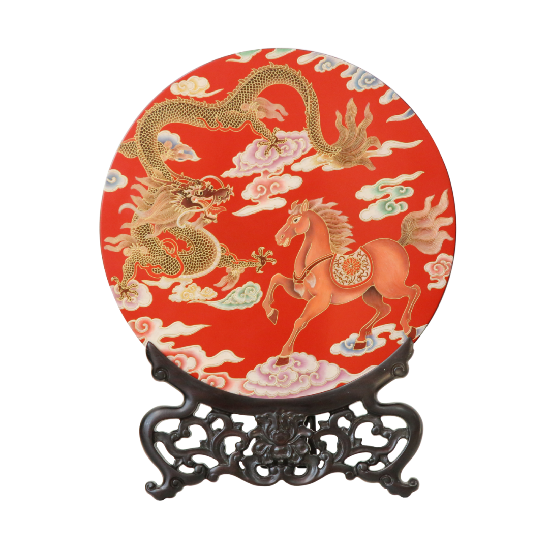 “漆礼·马上有福”系列赏盘以祥云化作马身轮廓,其间点缀寿桃、蝙蝠等吉祥图案,马首微侧,代表“马上有福”的吉祥寓意。