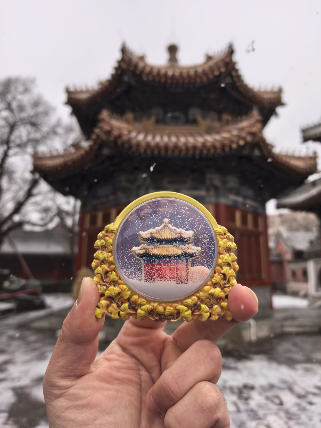 乾隆御碑亭立体流沙冰箱贴以博物馆乾隆御碑亭建筑为主体,搭配背景画面及银杏叶设计,冬款冰箱贴主要特色在于冰箱贴中间圆鼓,圆球内的乾隆御碑亭建筑为立体呈现,随着雪花缓缓落在建筑上、地面上通过其独特的动态效果和设计灵感营造动态的美感和文化氛围。