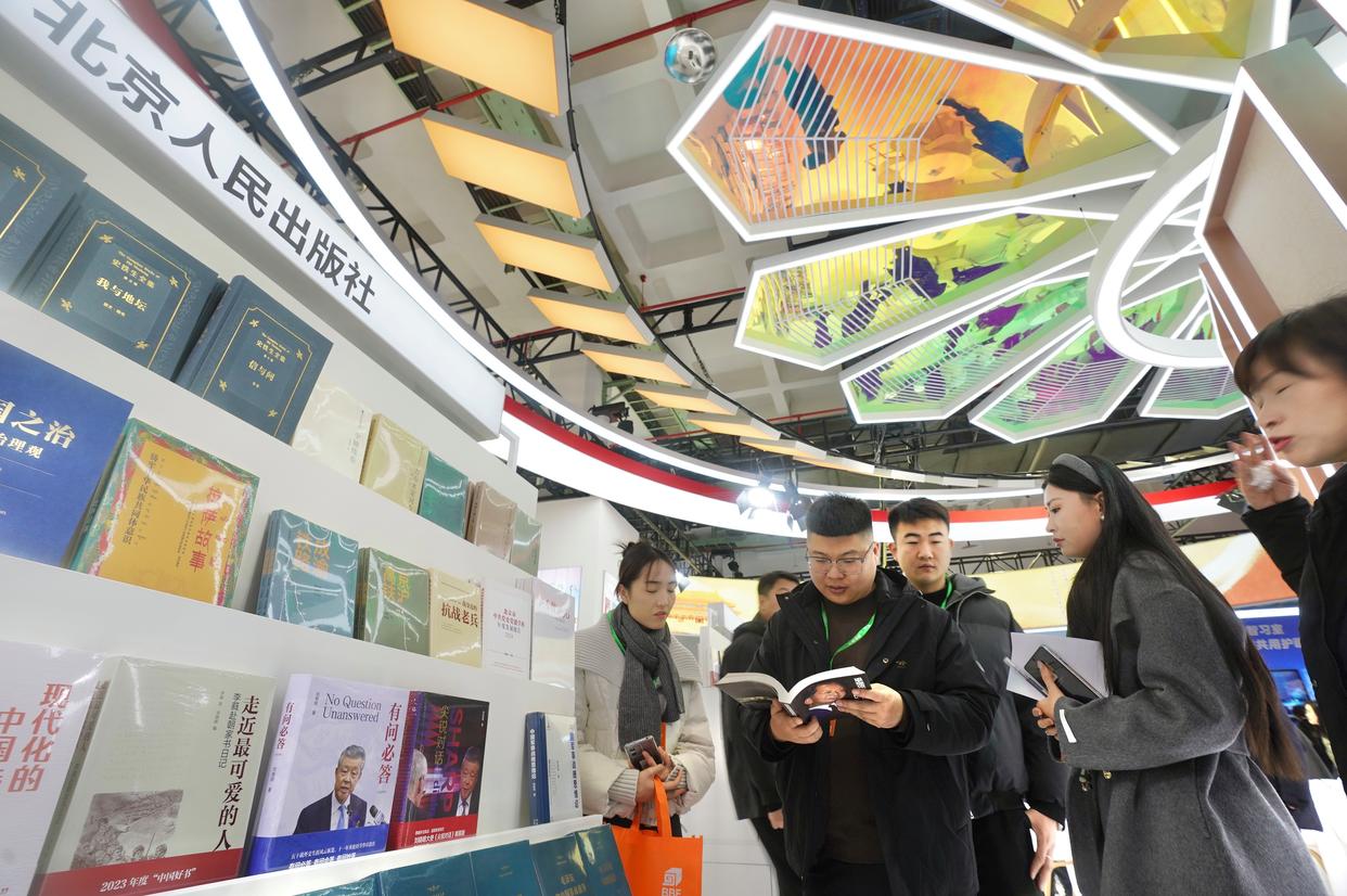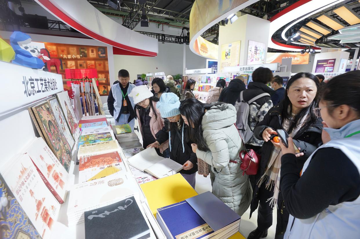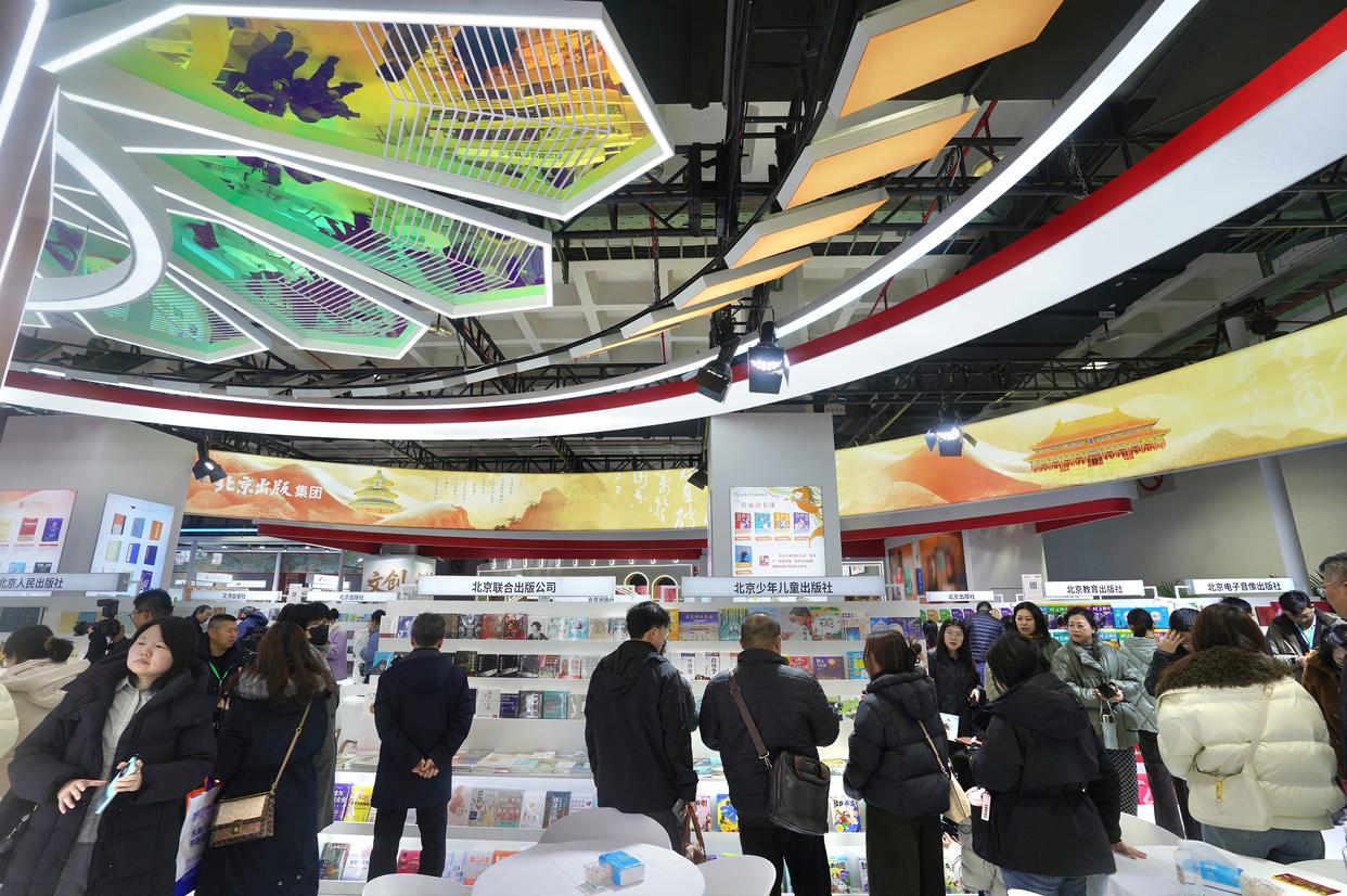 在展区的显著位置,融媒体区集中展示了电子书、有声读物、课程视频、数字平台及融合发展项目五大类80余种数字产品。在现场,系统梳理北京文化内涵的“北京文化书系”电子书可免费试读,承载非遗传承价值的“北京非遗传承丛书”有声读物可供读者畅听,汇聚北京名师资源的教材教辅系列视频课程开放部分可试看。
