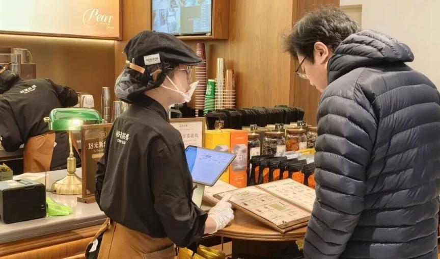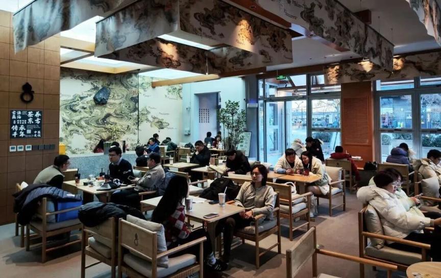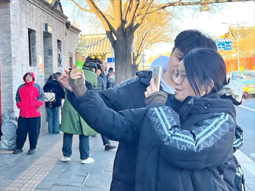 在前门东街与鲜鱼口街交叉处的顺时而饮(前门旗舰店)内,年轻人三三两两围坐桌前,手中的驴打滚牛乳茶泛起绵密奶泡,黄豆粉的醇厚香气与清新茶香交织弥漫,勾勒出一幅冬日北京街头的新式休闲图景。