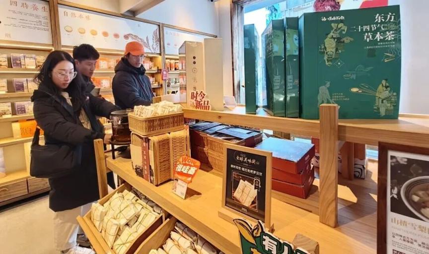 产品创新之外,场景革新与文化赋能让顺时而饮成功打破老字号的地域与年龄限制,实现了从产品到品牌的全面破圈。顺时而饮(前门旗舰店),与天乐园大戏院、便宜坊烤鸭店等百年老店为邻,与长春堂老药铺始创店仅隔一条马路,地理位置得天独厚。门店集零售产品、手作草本饮与人文茶座于一体,成为游客感受京味文化、体验新式养生的重要站点。“驴打滚牛乳茶很有老北京特色,味道很新颖,适合我们年轻人,二十四节气养生茶打算带回去给家里老人尝尝。”专程前来打卡的外地游客王女士说。