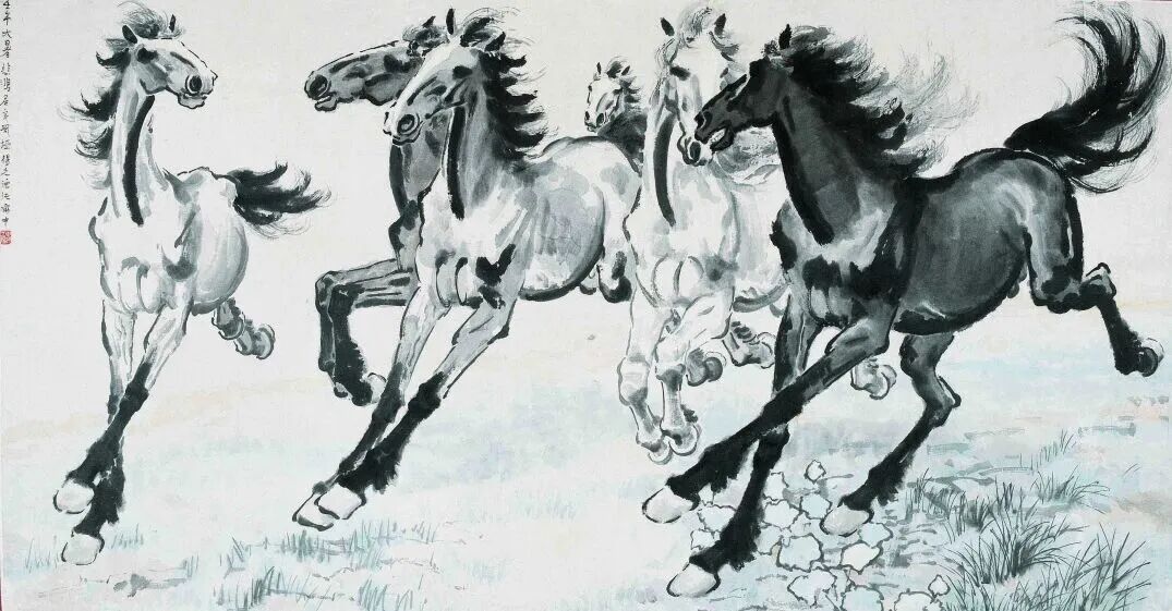 徐悲鸿笔下的奔马,是“一洗万古凡马空”的艺术突破。他打破传统马画的桎梏,以西方解剖、透视为骨,以中国水墨写意为魂,创作出“形神兼备”的独特奔马美学。