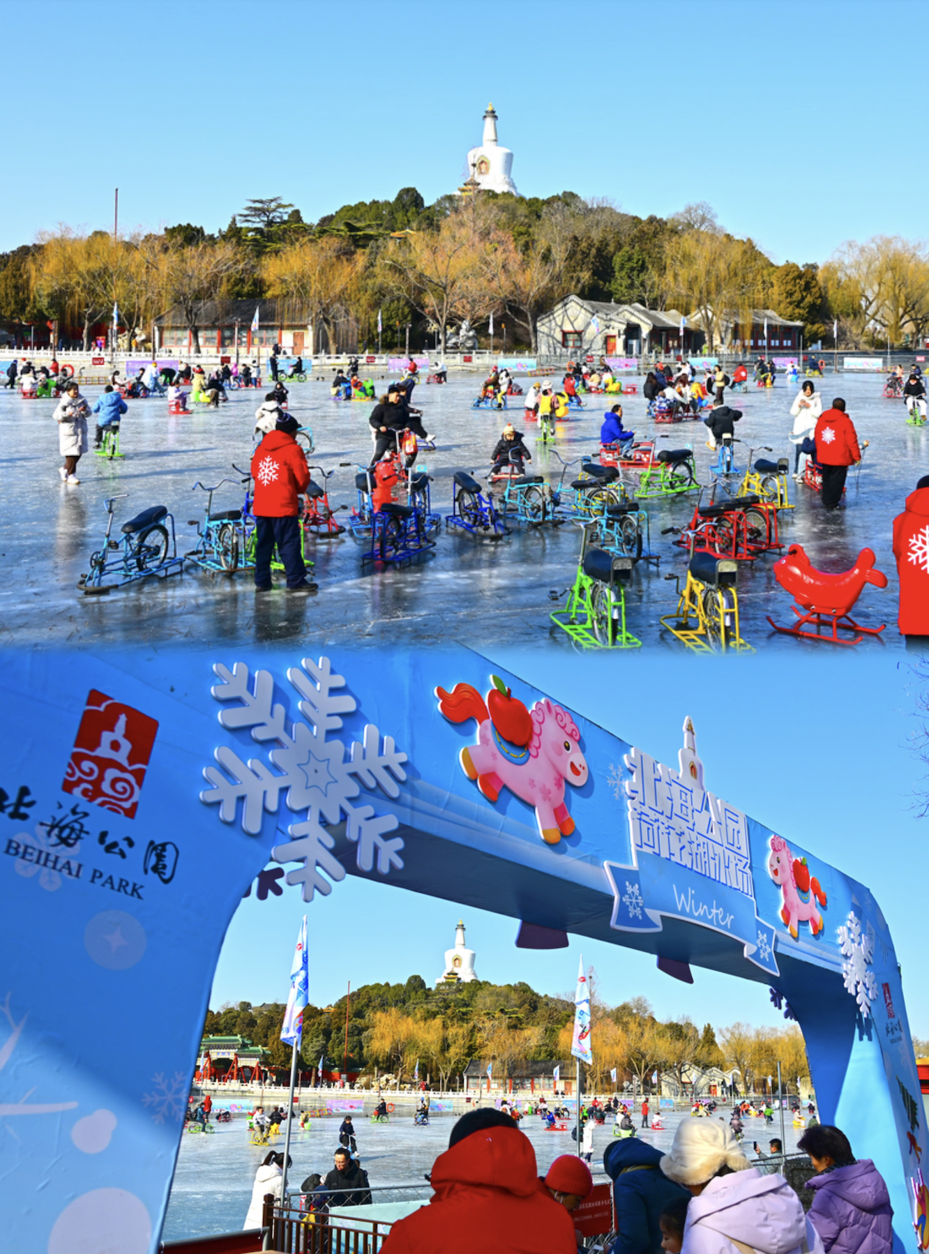 1月24日,北海公园荷花湖5000余平方米的天然冰场开门迎客,为市民游客送上冬日限定的冰雪乐趣。现场,各式滑车穿梭往来,一张张笑脸洋溢着欢乐喜庆。冰场预计运营到2月4日。(图/Sipa图库)