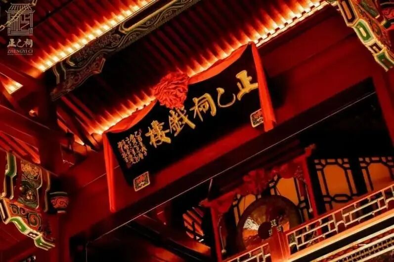 《天官赐福》为梨园经典吉庆戏,赐福天官率领南极老人、五谷牛郎、天孙织女、送子张仙、增福财神等前往阶庭颁赐福禄。该剧曲词祥瑞,且正乙祠前身为明代财神庙,供奉正乙玄坛老祖赵公明,春节期间演出《天官赐福》,戏楼之古韵、昆曲之雅韵与祈福之美好寓意叠加,沉浸感极强。