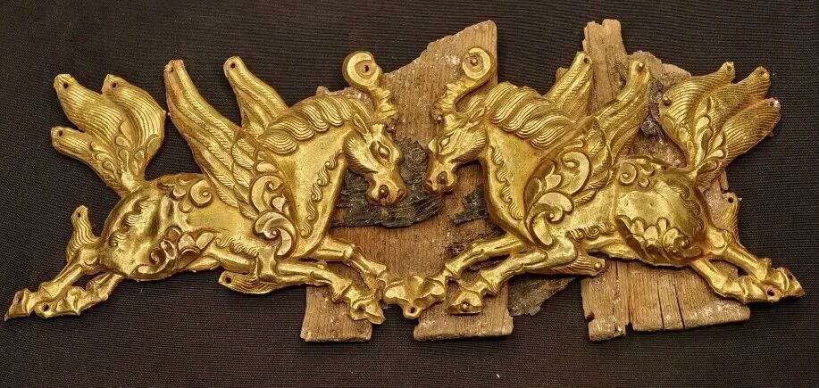 展览展出香港故宫文化博物馆珍藏的170余件(套)金器精品,时间跨度自公元前15世纪至明代,展品全部为首次在中国大陆地区亮相,部分展品为全球范围内首次公开亮相。展品涵盖首饰、腰带饰件、车马饰、礼仪用具等类型,包含公元前15世纪-13世纪的喇叭口金饰、战国至汉代的卷曲动物纹饰牌、吐蕃时期骑射武士形饰牌及明代双龙戏珠纹梁冠等代表性器物,展现锤揲、浇铸、鎏金、金珠与宝石镶嵌等工艺发展脉络。展览金器的纹饰题材多样、制作工艺精湛、艺术风韵独特,犹如给我们开启了一扇历史的“黄金门扉”。