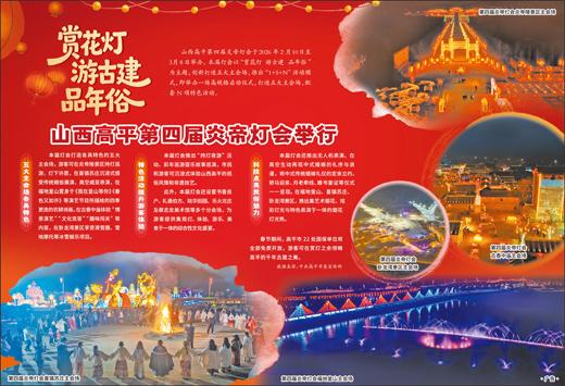 山西高平第四届炎帝灯会于2026年2月10日至3月8日举办。本届灯会以“赏花灯 游古建 品年俗”为主题,创新打造五大主会场,推出“1+5+N”活动模式,即举办一场高规格启动仪式,打造五大主会场,配套N项特色活动。