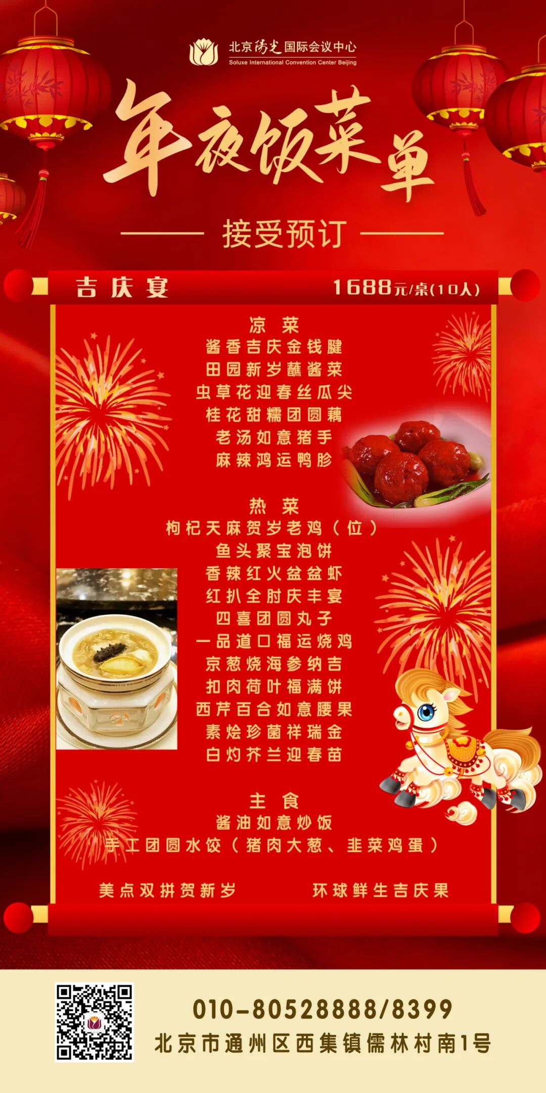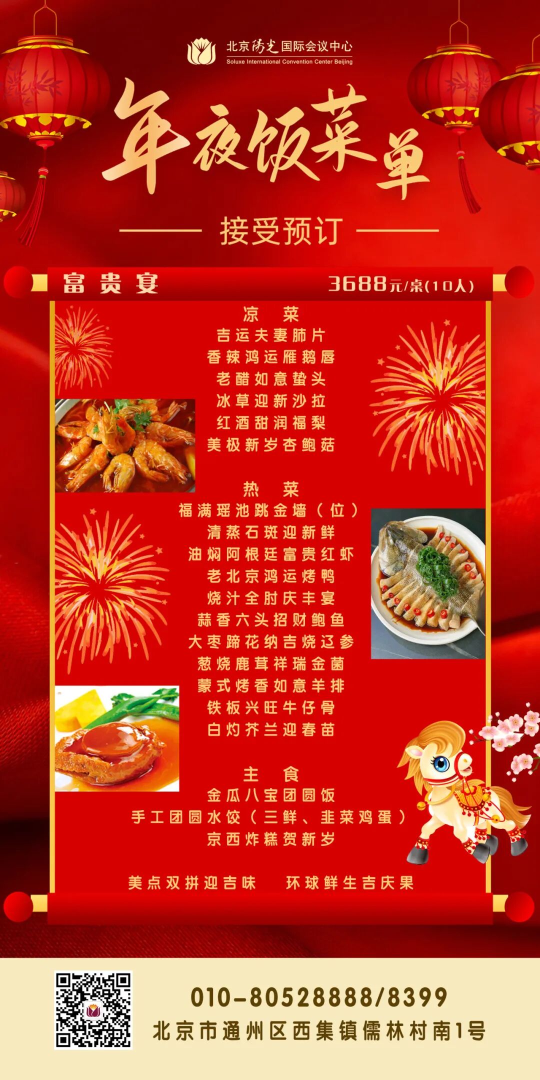 春节期间,会议中心为您精心准备了三档寓意吉祥的年夜饭套餐,分别为吉庆宴(1688元)、豪华宴(2688元)及富贵宴(3688元),可满足不同家庭与宾客的用餐需求,诚邀您与亲友在此共聚团圆、喜迎新春。
