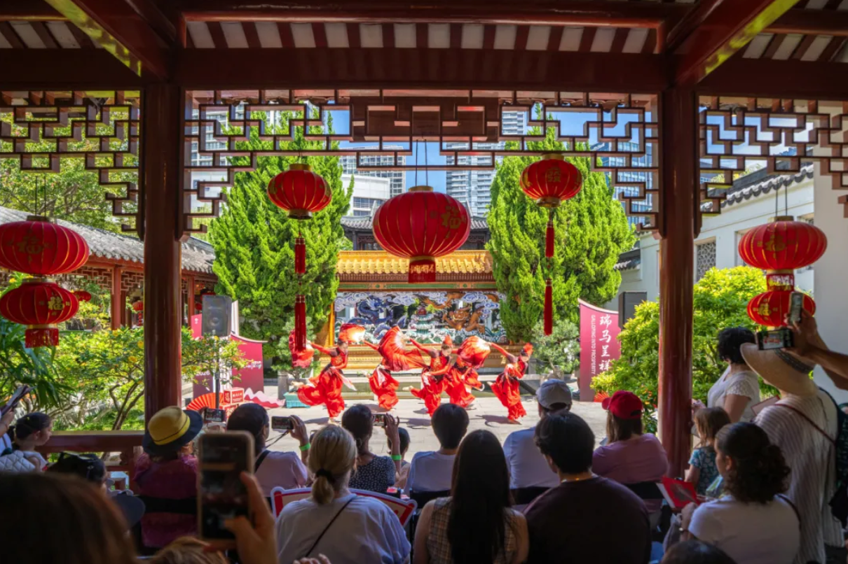 本次“欢乐春节”游园会在悉尼谊园举办,将文艺演出巧妙融入园林的亭台、水榭与曲径之中,使中国文化在山水意境中自然流淌。悉尼观众可在“移步换景”中体验“戏在景中演,人在画中游”的沉浸情境,深切感受北京文化的浓厚底蕴与新春的美好祝福。