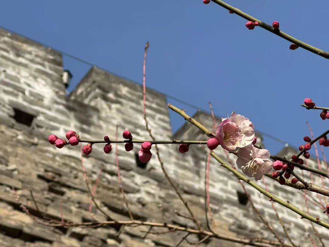 除了金黄和洁白之外,粉色浪漫也已来袭。在明城墙遗址公园南门旁,五六株提早盛开的粉色和白色梅花,吸引了不少市民游客前来欣赏。“白色的是北京玉蝶梅,粉色的多为宫粉梅或朱砂梅。”公园工作人员介绍,这几株梅花是园内每年最早开放的品种。