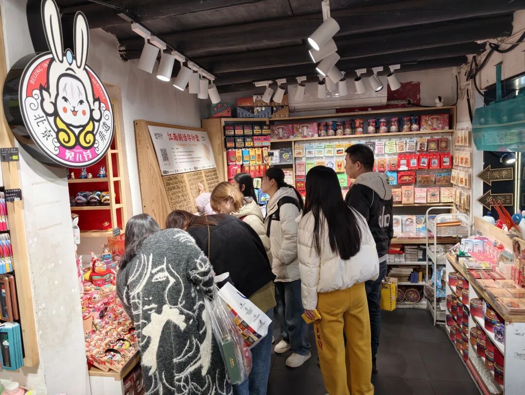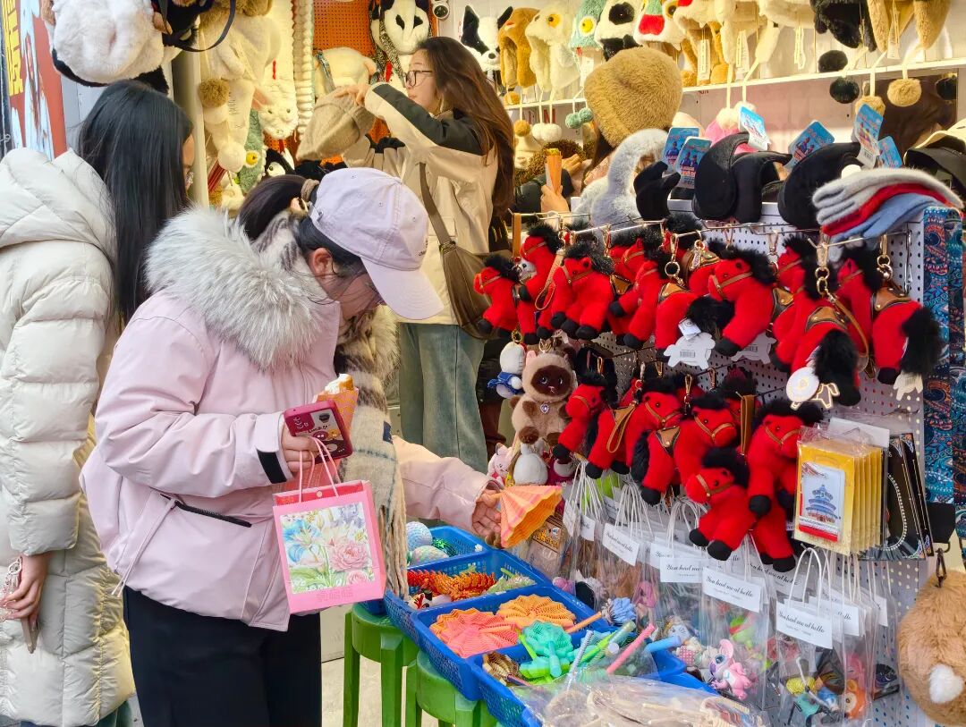 漫步主街,马年元素成为街头亮眼的风景。“南锣年货节”市集是“韵东城·潮南锣”非遗国潮季活动之一,市集上,红彤彤的小马挂件深受游客们的喜爱,成为背包上的潮流装饰,随手一挂,新春的喜庆感拉满;北京兔儿爷非遗文创小店里,马年生肖兔儿爷泥塑手办刚一上新就成了爆款,兔儿爷贺岁款式也备受游客青睐,不少家长带着孩子挑选,把非遗年味带回家;中华老字号北京稻香村店内人头攒动,牛舌饼、枣花酥、山楂锅盔等经典糕点成为热卖品。“来北京旅游,带点北京稻香村的糕点当伴手礼,是送给家人朋友的心意。”正在挑选糕点的游客张女士说道。