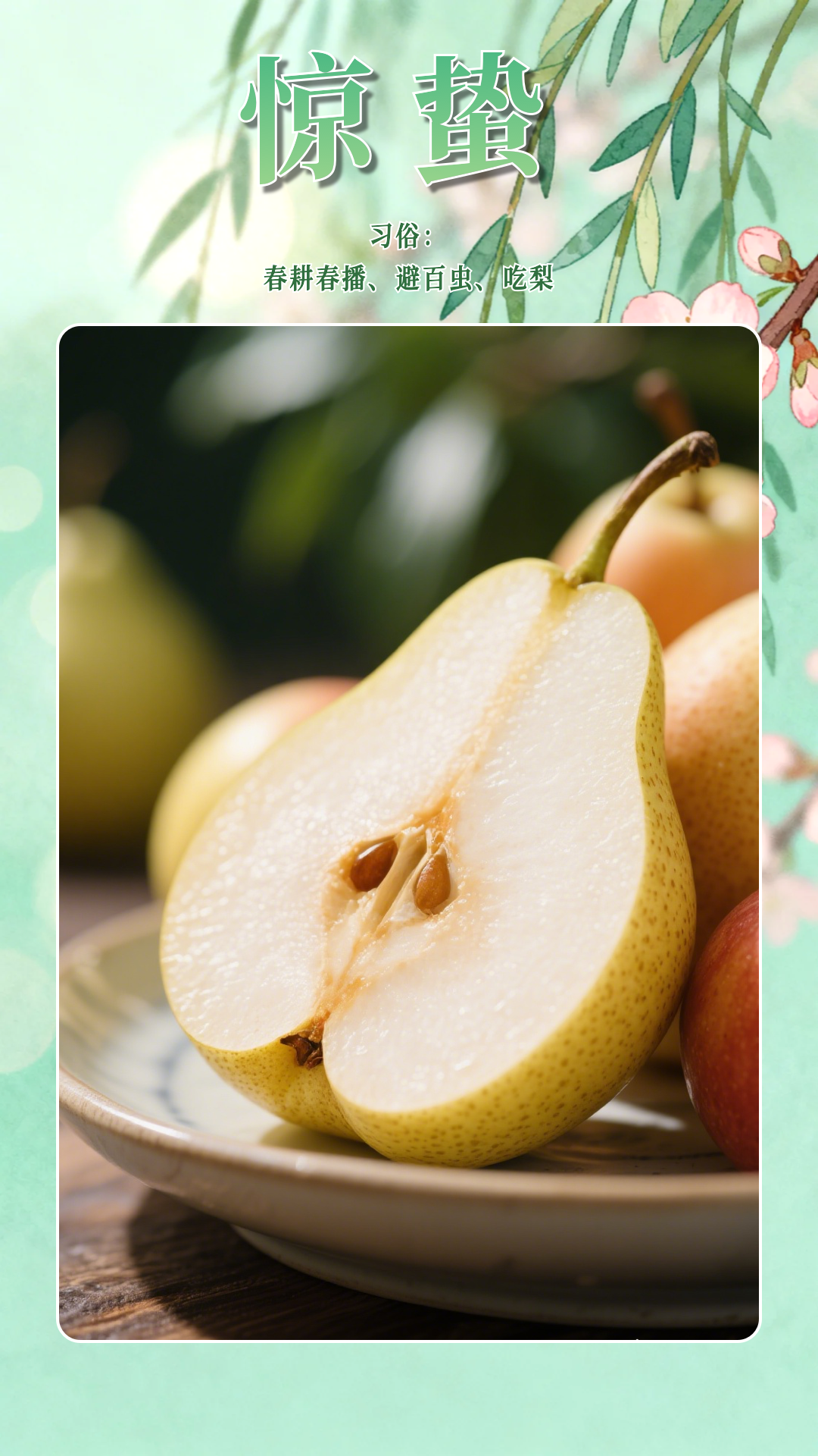 惊蛰有吃梨的习俗。一方面,这一时节气温升高,比较干燥,吃梨有滋阴清肺的功效;另一方面,梨同“离”谐音,惊蛰吃梨可以求一个远离害虫、远离灾病的好兆头。