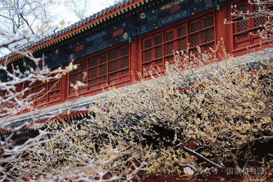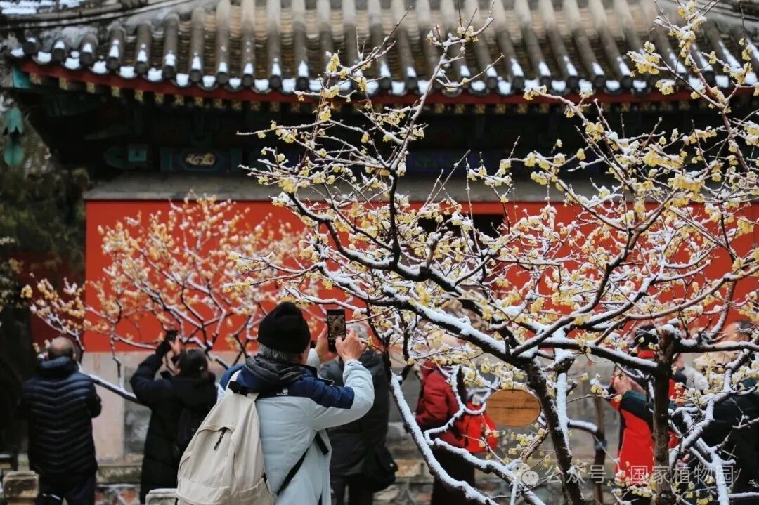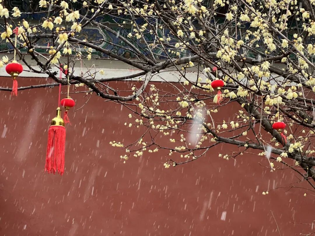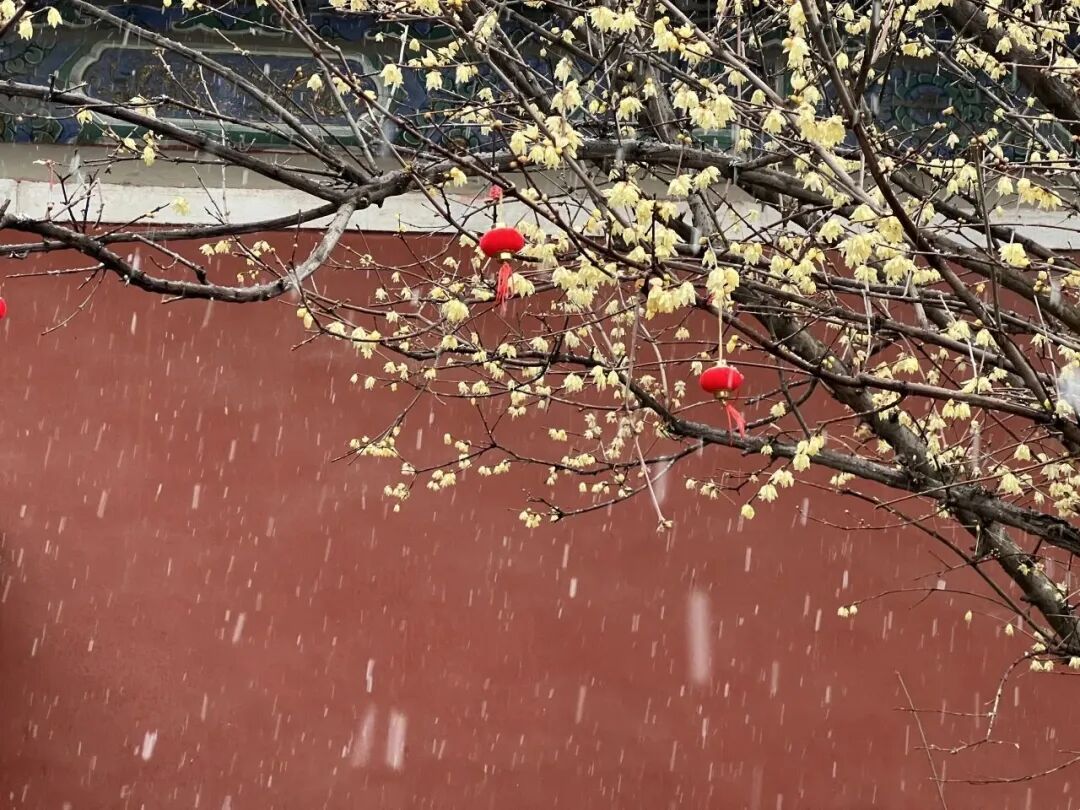 北京的雪更为这景色增添了一番风味,白雪落在琉璃瓦上,也轻轻覆在蜡梅枝头,花瓣上挂着细小的雪粒,让人一眼就能感受到春与冬交织的独特韵味,市民游客驻足拍照,在古建与花影之间感受这份属于春天的美景。