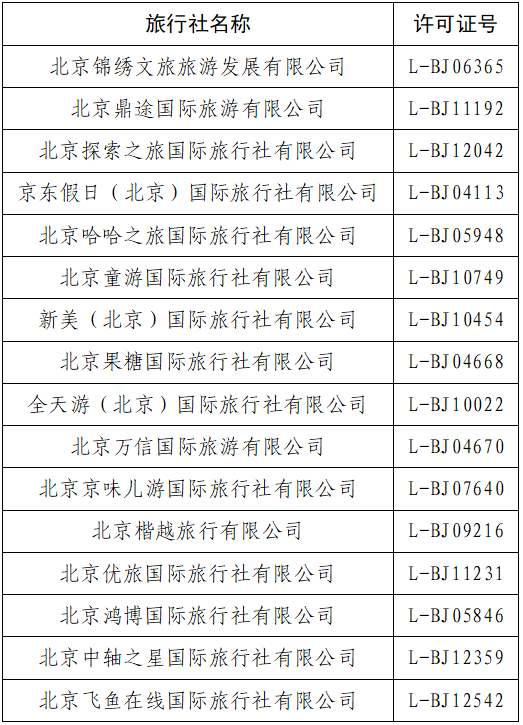 本期上榜旅行社,除新美(北京)国际旅行社有限公司、北京鸿博国际旅行社有限公司外,其余14家旅行社前期均因存在违法违规问题或者投诉较多,已经被暂停了北京市旅游团队电子行程单系统备案权限。北京市文化和旅游局提醒广大游客、旅行社同业、在线旅游平台,请选择投诉少、服务好、信誉高的旅行社参团或合作。