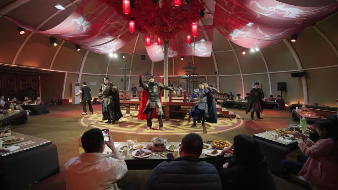 梦华长城剧场独创“观演—游历—宴饮”行浸式体验闭环,让游客化身历史故事的参与者。开城门仪式以喊话拉开序幕,点燃游客的边关探险热情;明代互市游历区里,游客可通过互动游戏赢取“银票”,兑换文创好物或解锁隐藏剧情;主剧目《梦华·长城》采用倒叙手法,融合“盛世繁花”与“铁血丹心”两大主题,观众随剧情行走于实景空间,深度参与故事发展;更有“将军宴”“秋光漫宴”等主题餐饮搭配《美丽延庆等你来》特色演艺,实现味觉与视觉的双重满足。