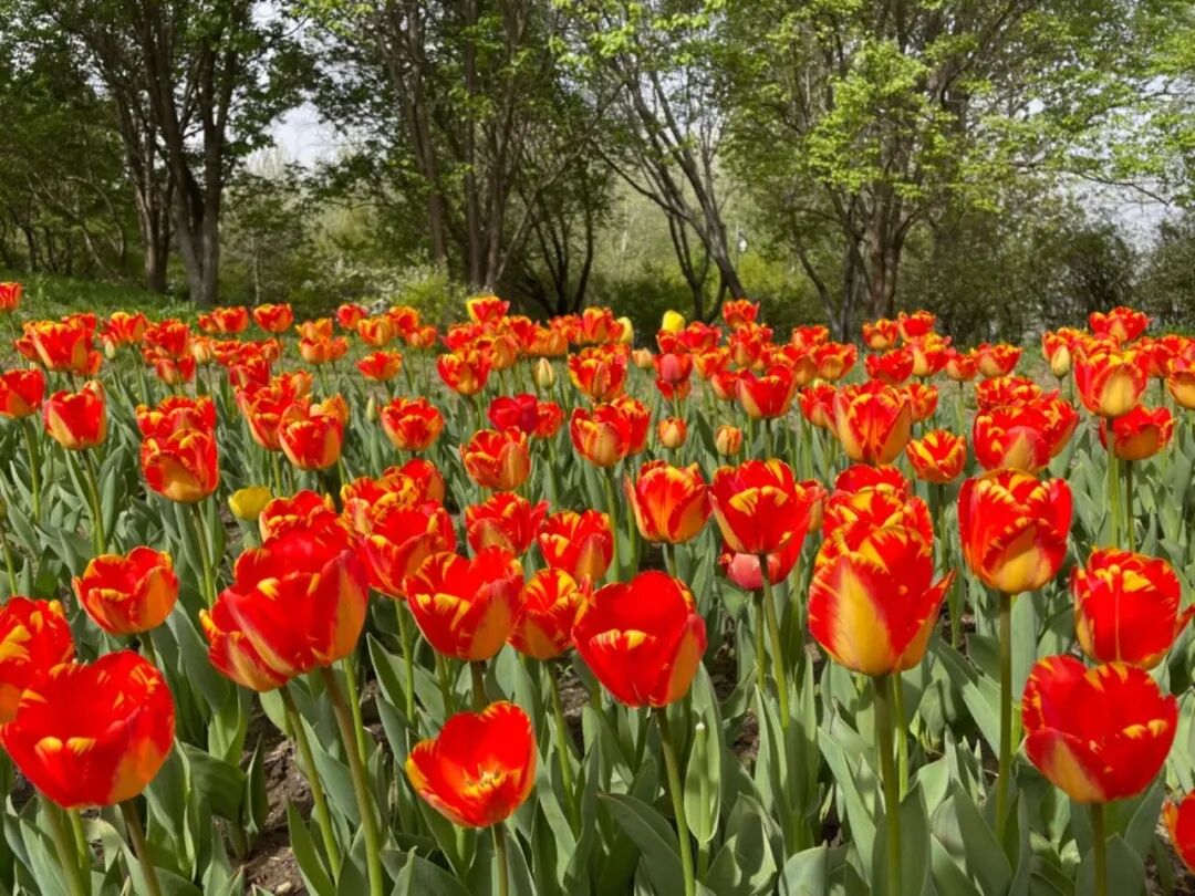 生态廊道桥上,大片郁金香迎风绽放,林下区域的二月兰、丁香、蒲公英等也陆续开放,为游客带来更多春日惊喜。