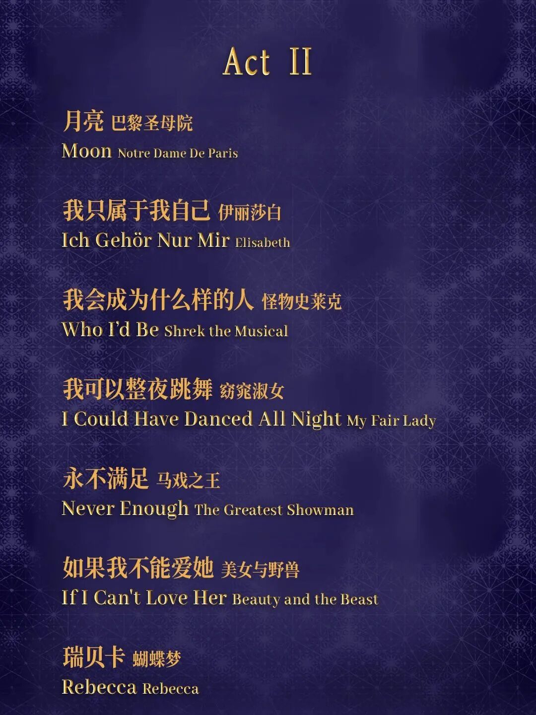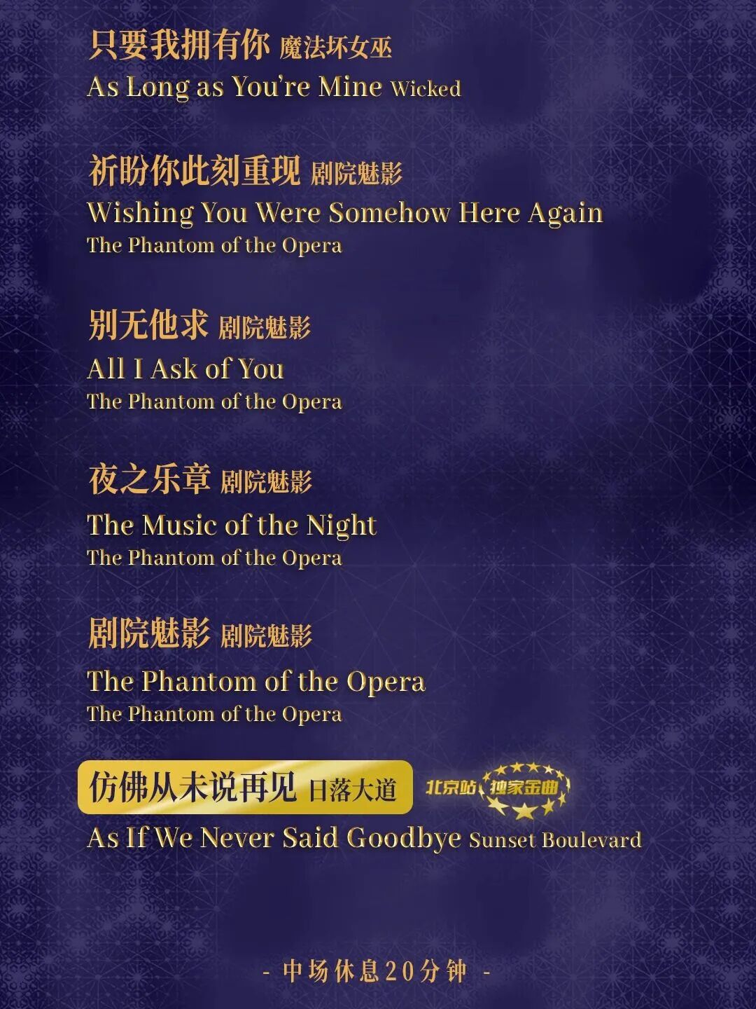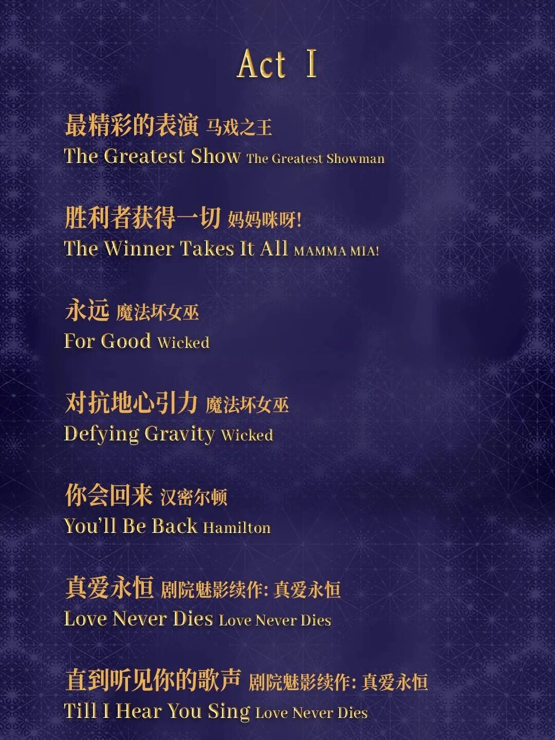 这是一场以音乐剧经典为线索串联起来的演出,六位优秀音乐剧演员将轮番登场,由《悲惨世界》《剧院魅影》《汉密尔顿》《芝加哥》《马戏之王》《日落大道》《魔法坏女巫》《伊丽莎白》《蝴蝶梦》等全球音乐剧顶级IP中的经典唱段构成这场音乐会。