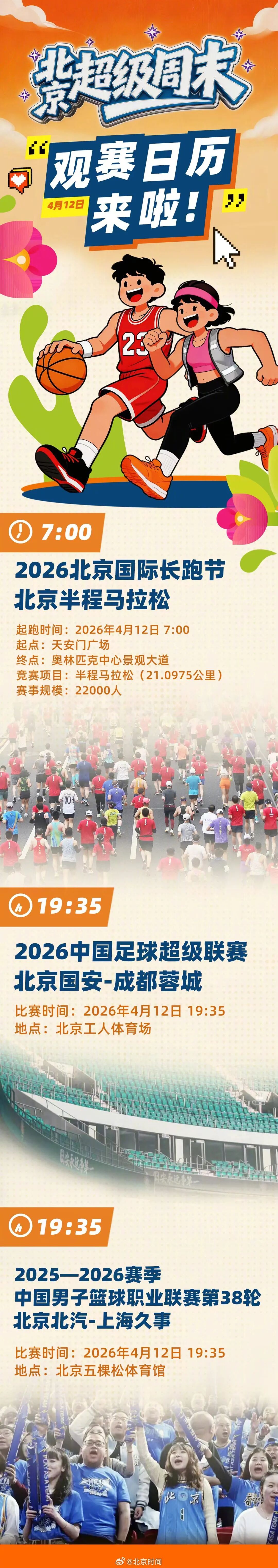 全程直播三场体育赛事:4月12日6:00-9:00,北京卫视、体育休闲频道同步直播2026北京国际长跑节—北京半程马拉松;19:30,体育休闲频道直播中超联赛(北京国安VS成都蓉城),新闻频道直播CBA联赛(北京北汽VS上海久事),实现体育赛事直播全覆盖。