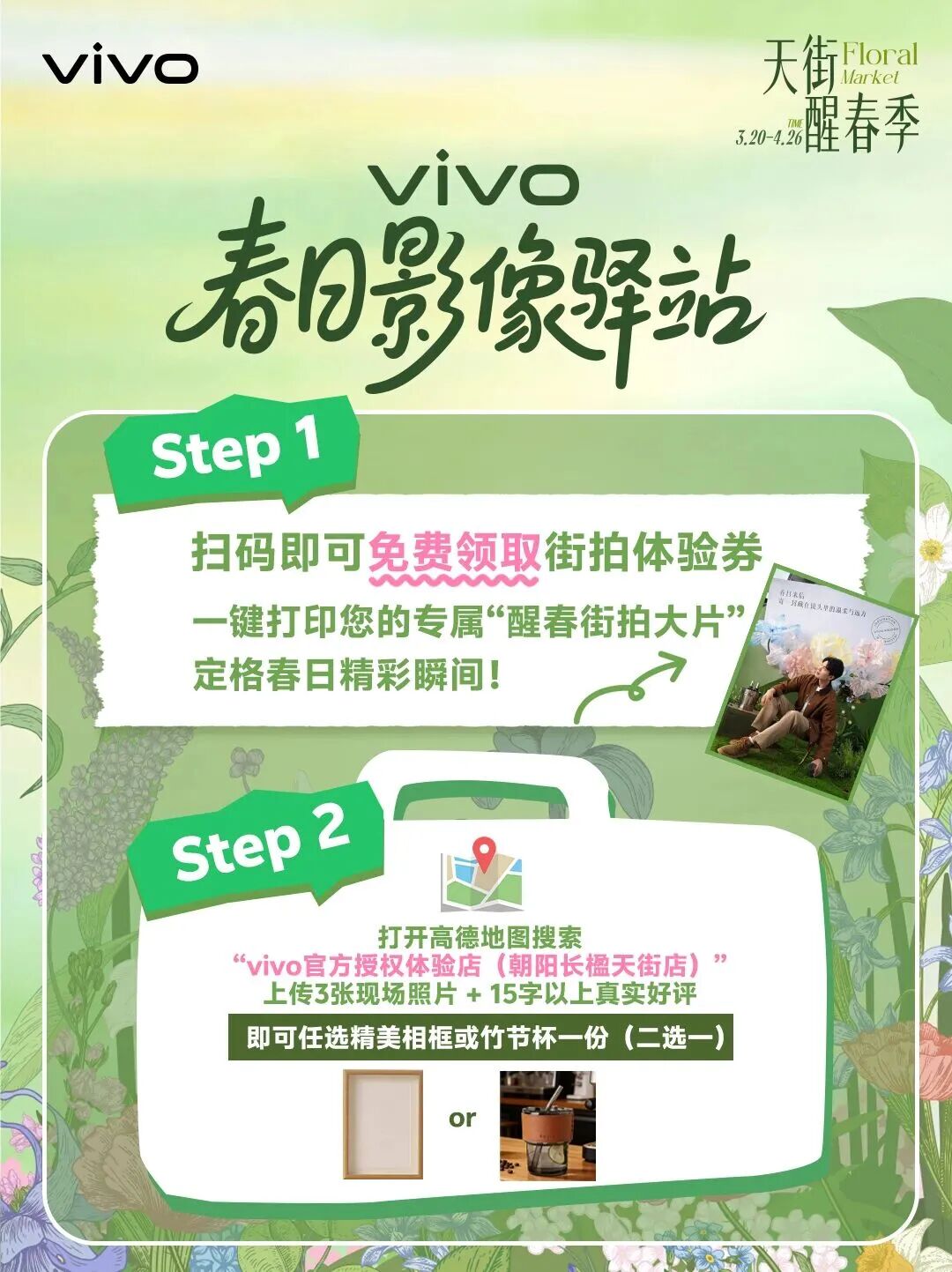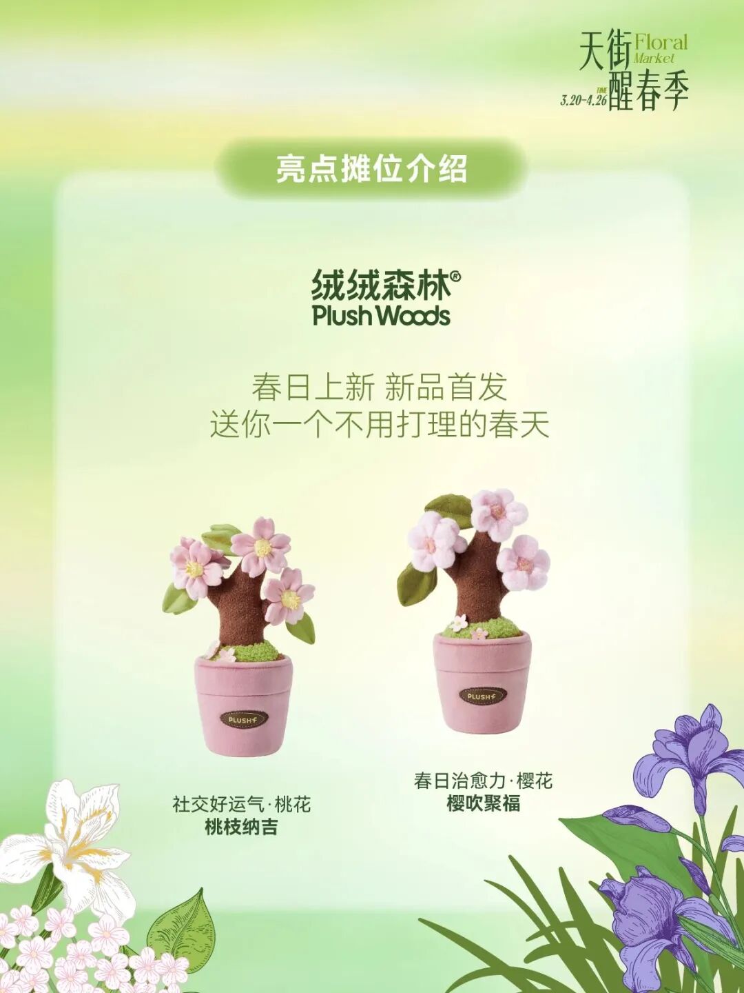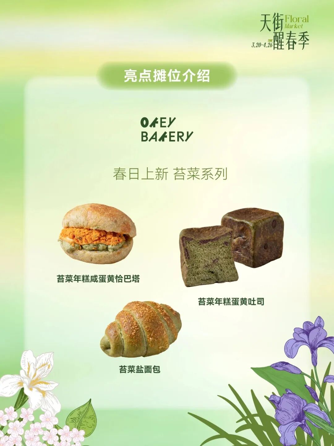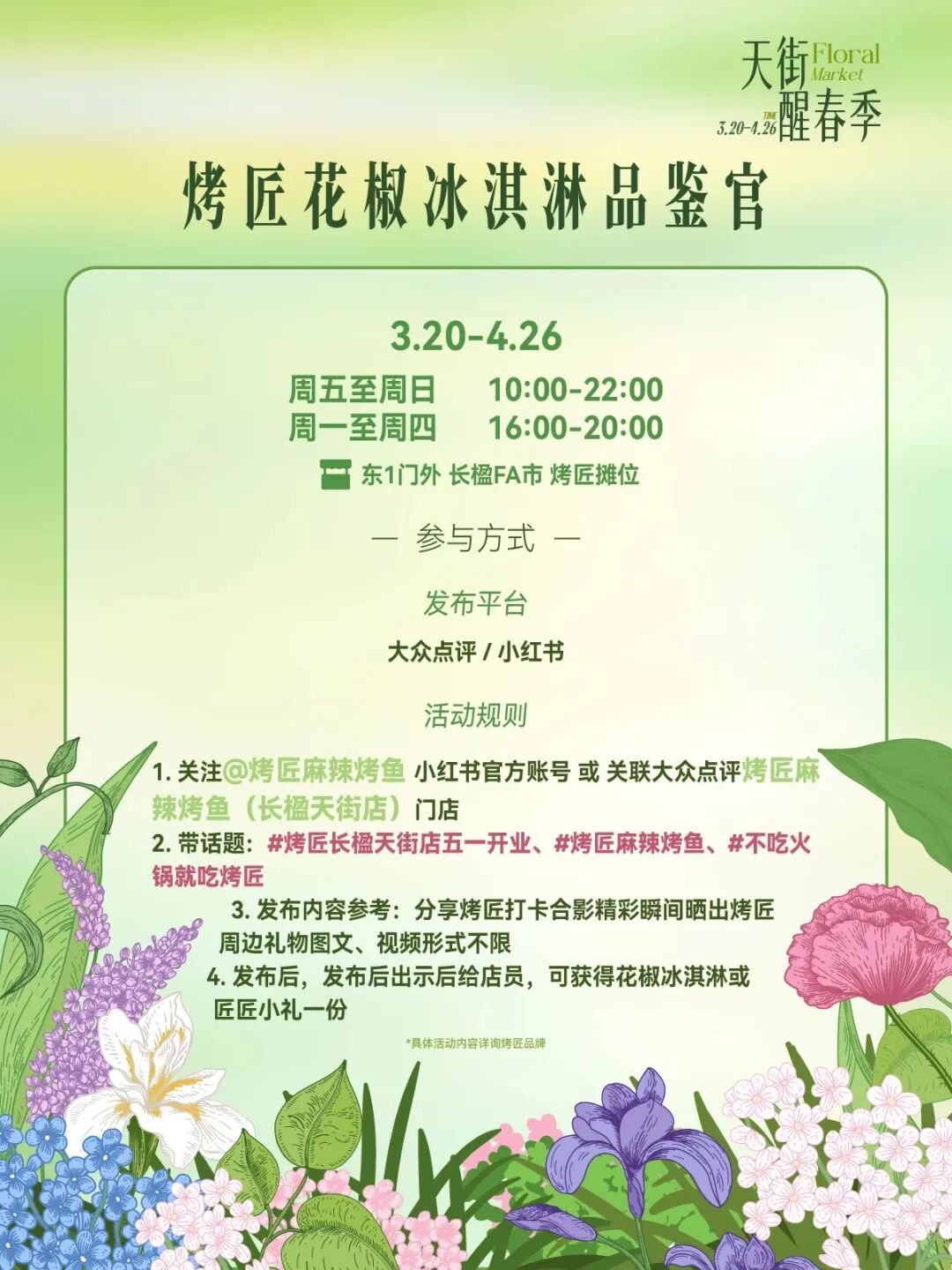 3月20日至4月26日天街醒春季长楹FA市开街,亮点摊位一站式打包春天,烤匠花椒冰淇淋免费品鉴,vivo春日影像驿站即刻出片,绒绒森林春日上新桃花&樱花,OKEY BAKERY春日苔菜系列上新,花植易物鲜切花、多肉、盆栽、中型植物供选择。