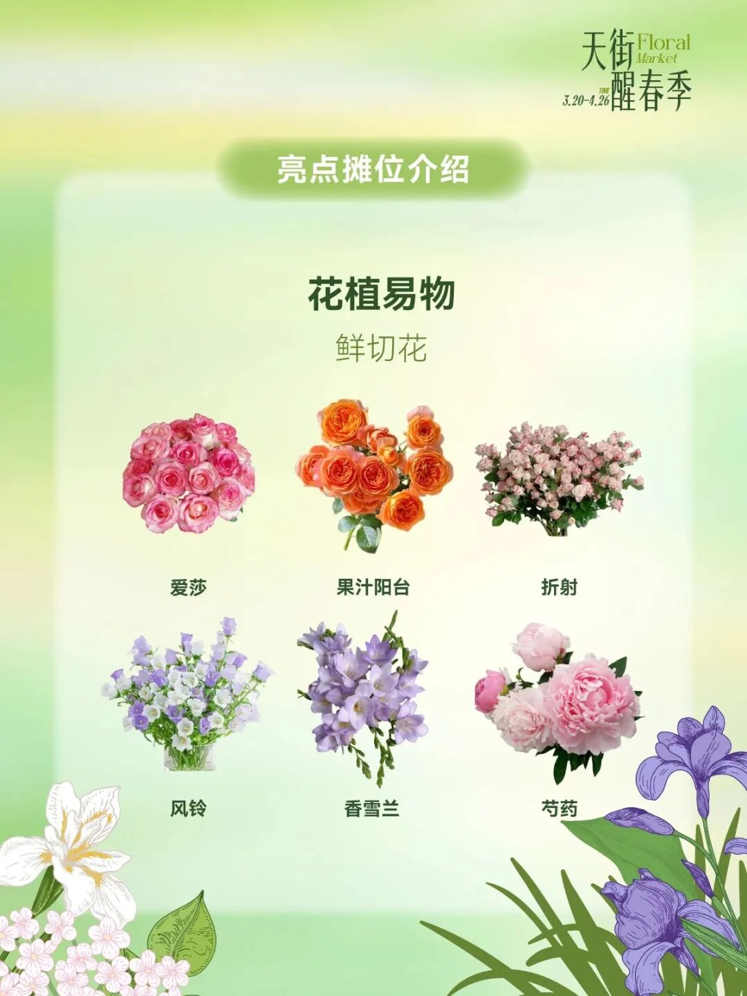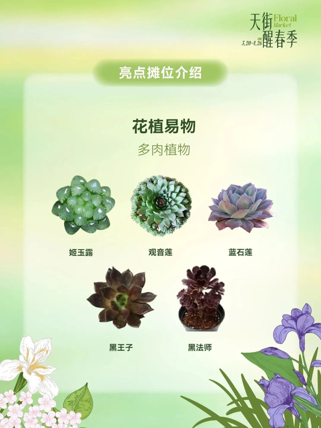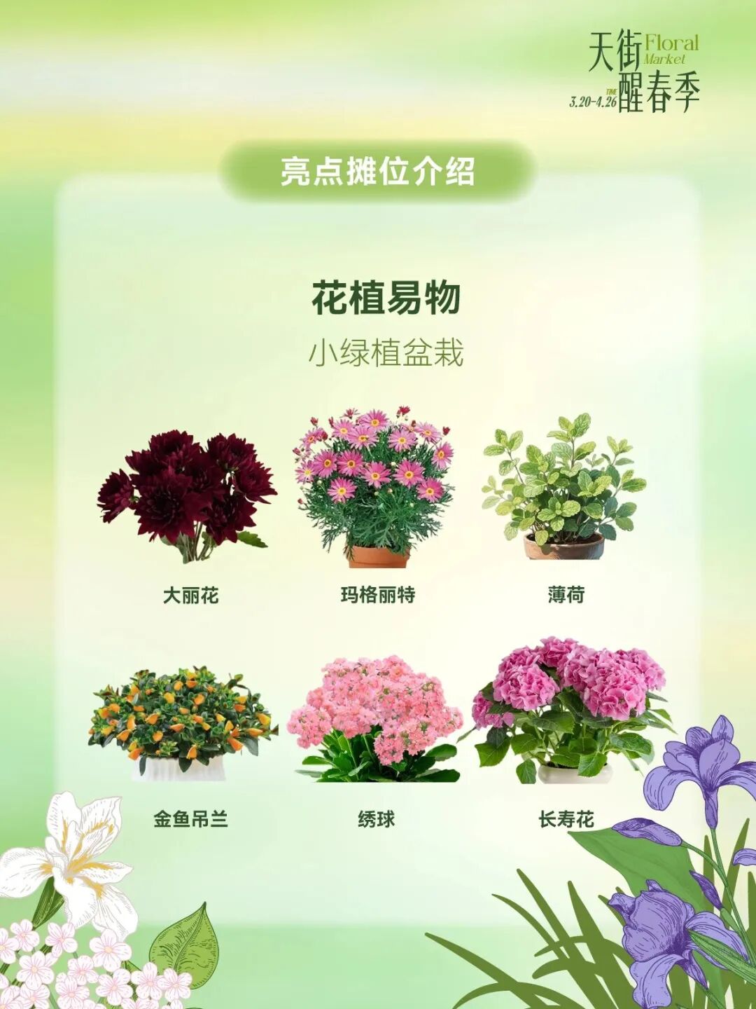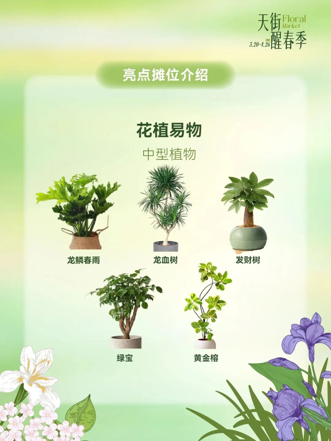 3月20日至4月26日天街醒春季长楹FA市开街,亮点摊位一站式打包春天,烤匠花椒冰淇淋免费品鉴,vivo春日影像驿站即刻出片,绒绒森林春日上新桃花&樱花,OKEY BAKERY春日苔菜系列上新,花植易物鲜切花、多肉、盆栽、中型植物供选择。