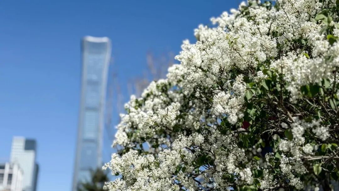 站在丁香谷的叠水旁抬头北望通惠河对岸,国贸、银泰、中国尊一字排开,玻璃幕墙倒映着流云,回头再看丁香谷,叠石流水,花影婆娑,“古今同框”的画面十分精彩。