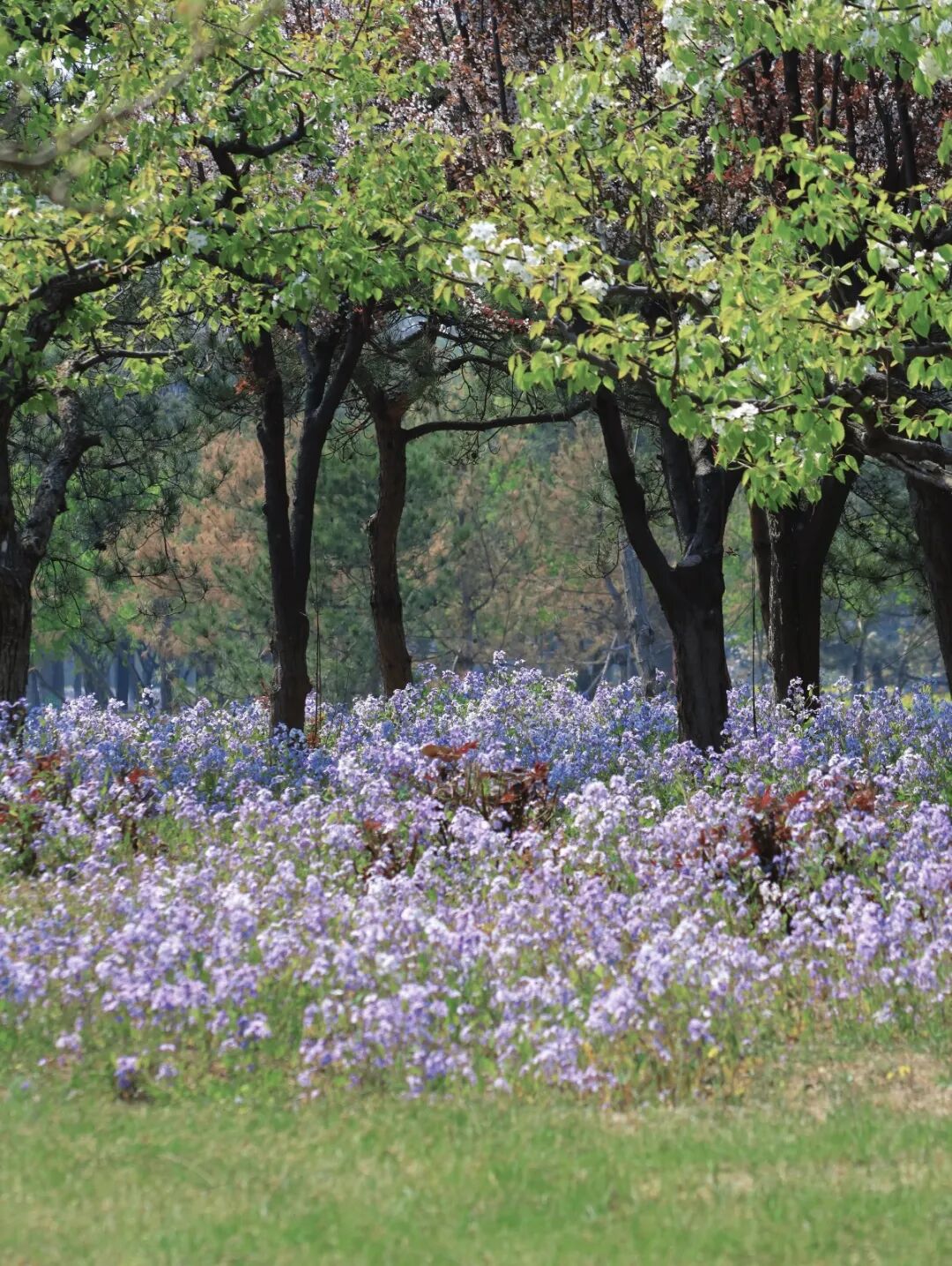 走进京城梨园首先映入眼帘的便是大片大片的二月兰,紫色的云霞一般铺满了草坪和林间小道。