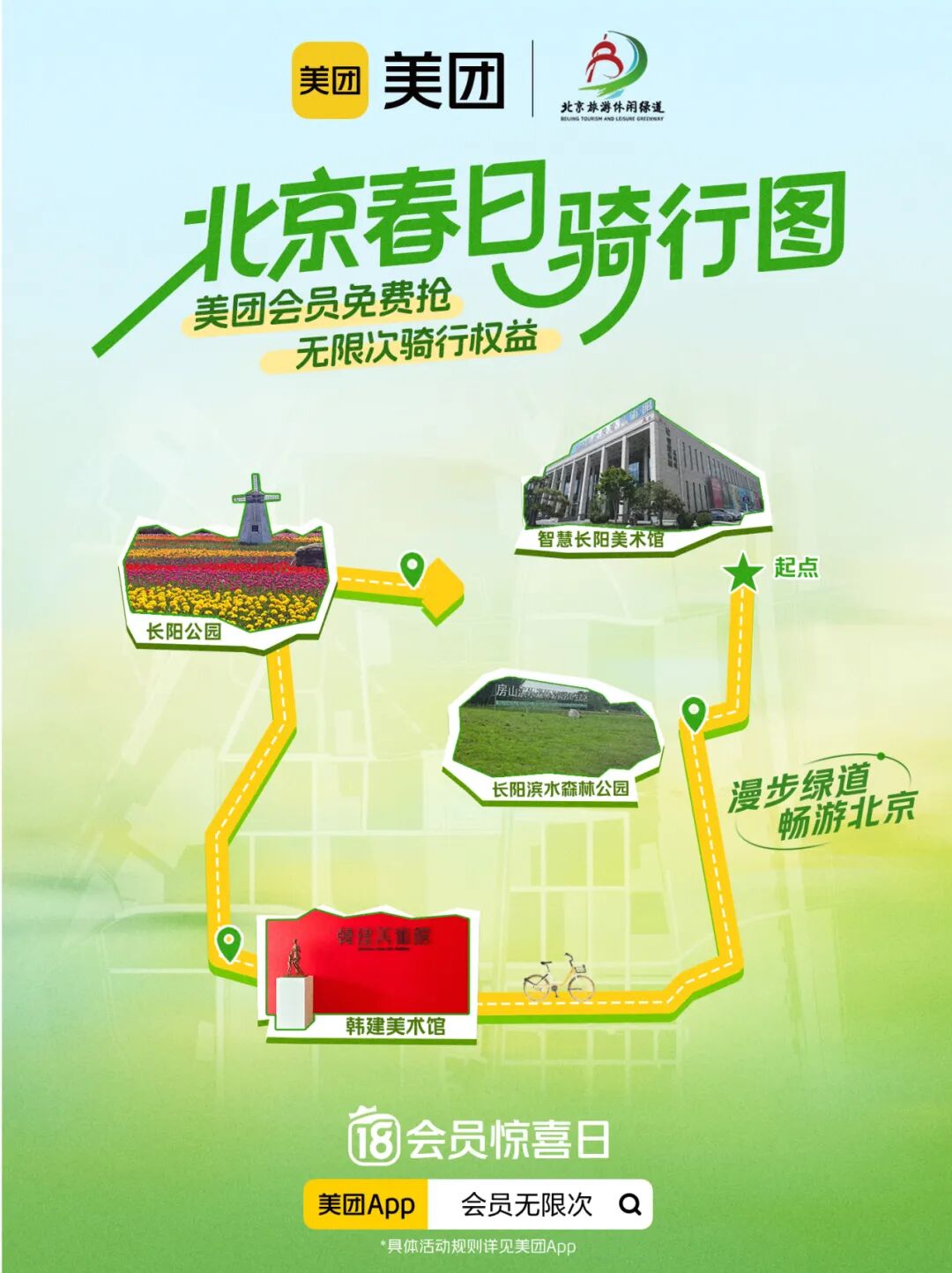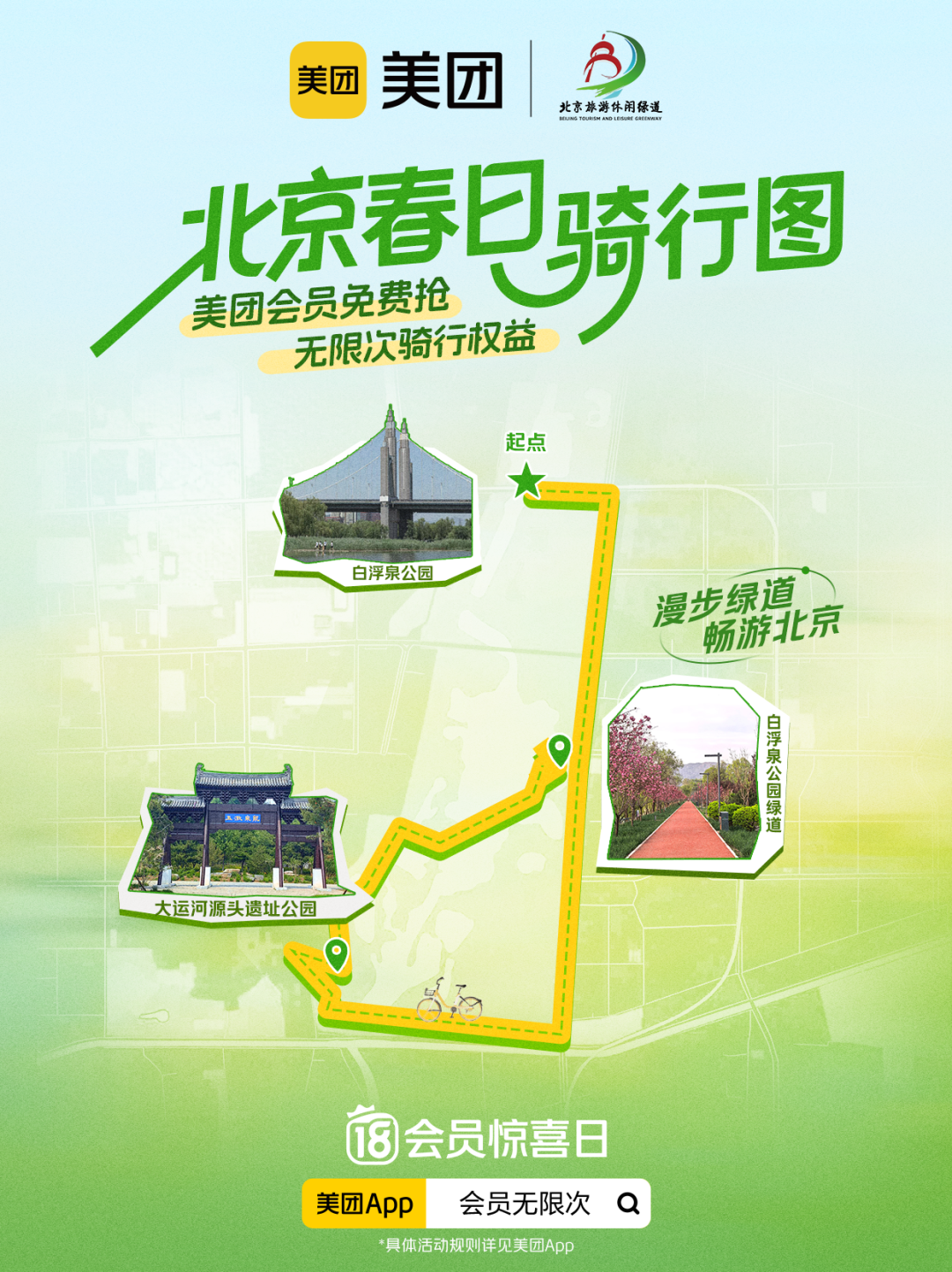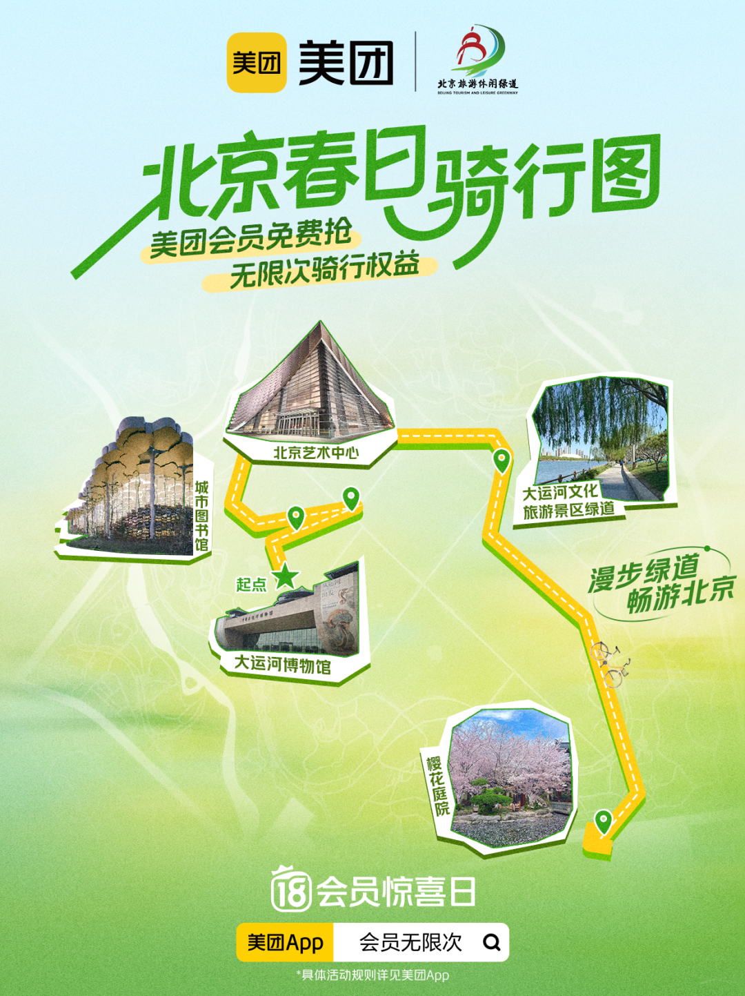 春风拂面,绿道生香。为进一步擦亮北京旅游休闲绿道品牌,丰富市民游客春日文旅休闲体验,激活绿道沿线文旅消费新场景,北京市文化和旅游局联合美团,推出“美团会员,解锁春天无限次”绿道骑行赏春活动,以绿色骑行串联生态风光、古都文脉与休闲消费,为市民游客打造“骑绿道、享春光、品美食、拍美景、赏人文”一站式春日文旅新体验。