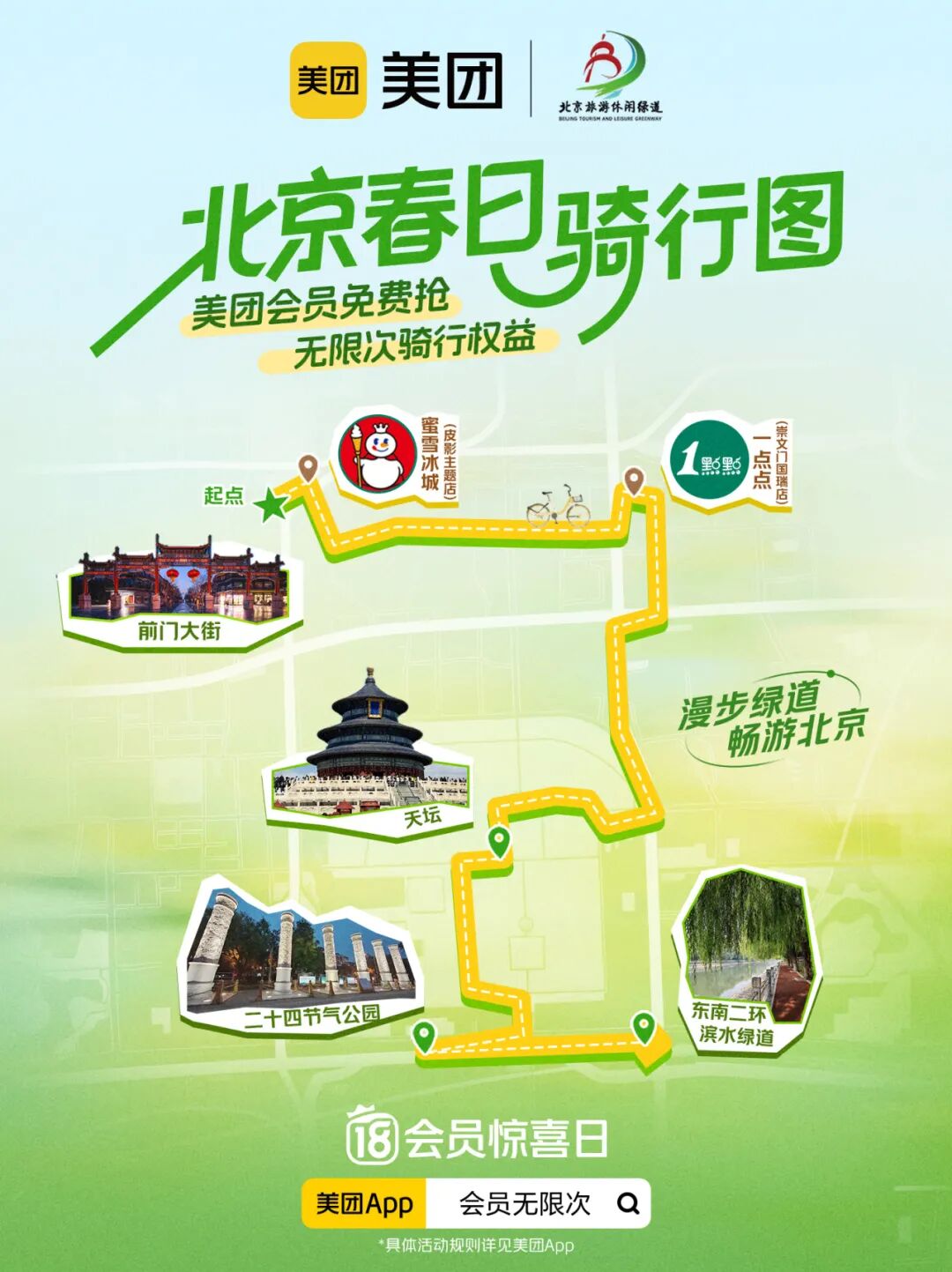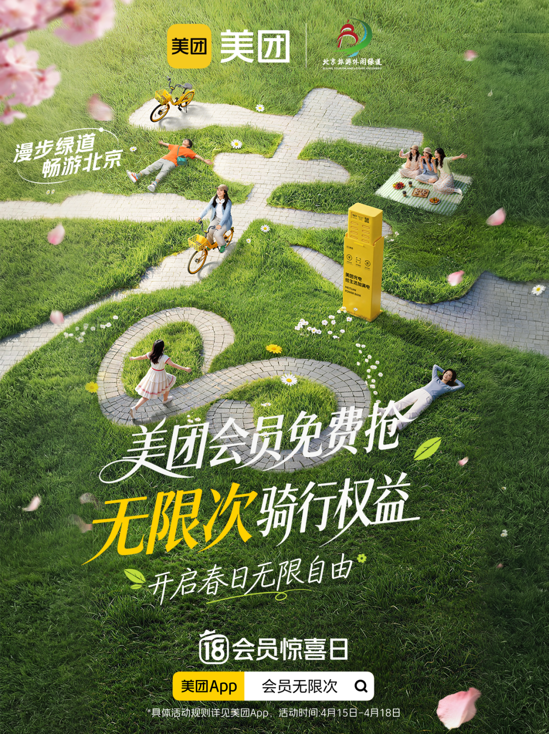 本次活动聚焦北京旅游休闲绿道全线场景,为市民带来实打实的骑行福利与沉浸式玩法,带动全民绿色出游。4月15日—18日,美团会员免费抢无限次骑行权益,轻松骑上共享单车,畅行北京旅游休闲绿道。