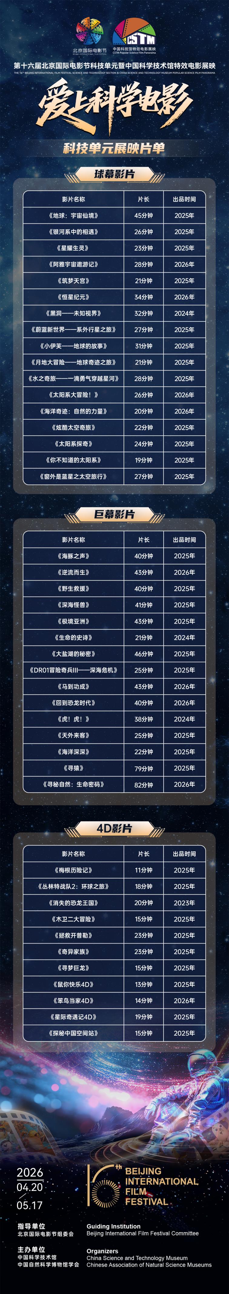 “科影同行”经典活动板块以科学电影展映为核心,依托球幕、巨幕、4D三大沉浸式影院,集中展示来自13个国家的44部精品影片。其中,全球首映9部,亚洲首映4部,中国首映14部。影片内容涵盖航空航天、动植物保护、史前生物、生态环境等多元科普主题。片长10至82分钟,覆盖全年龄段观众,兼顾科学爱好者与亲子家庭观影需求。