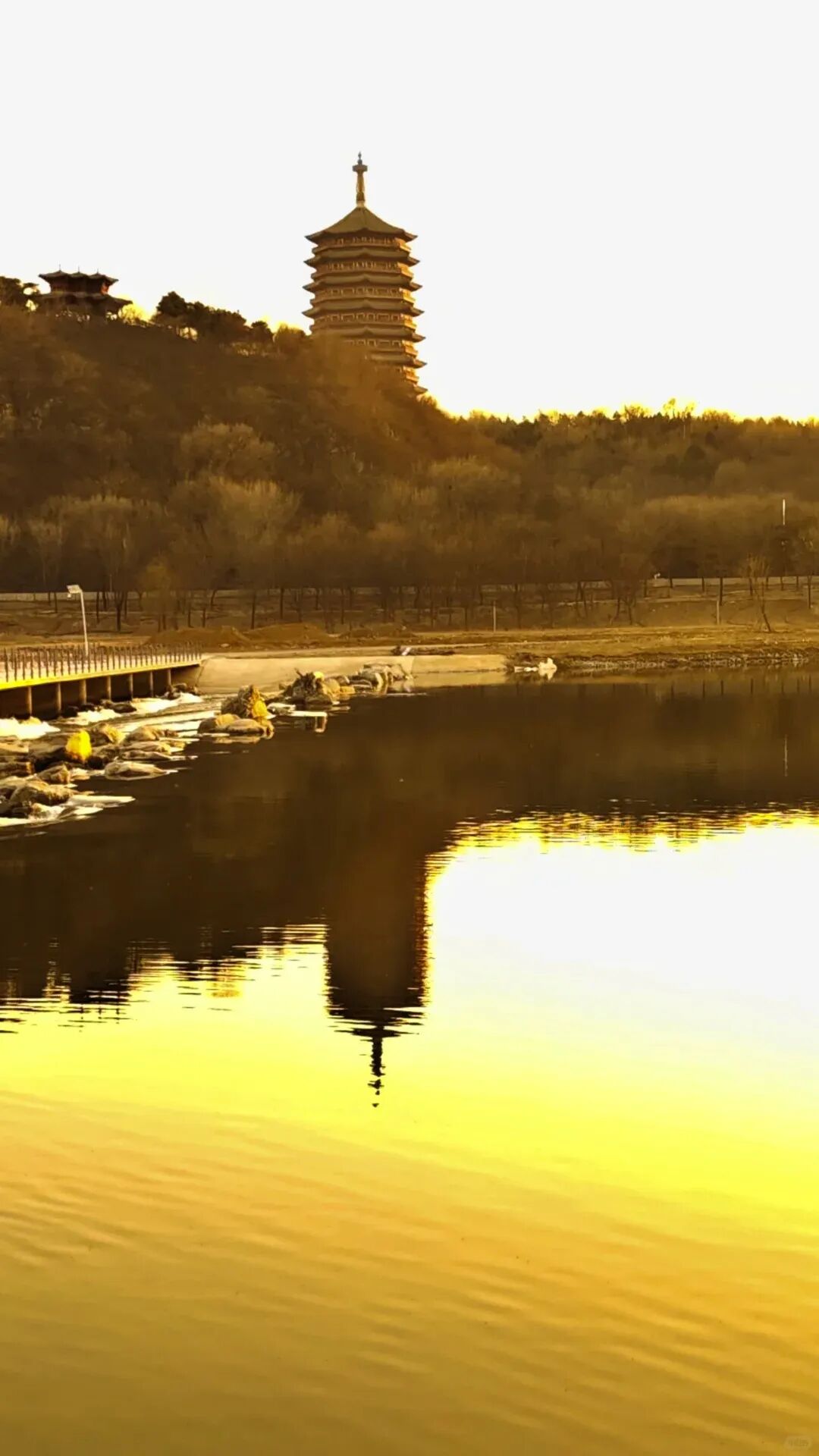 5号门入园左转沿银杏大道行至河堤路,向北行进看到京原铁路桥,走过铁路桥后可见带蓝色链条护栏的水泥桥(下文简称“蓝链桥”)桥中央偏东栏杆处,是全园唯一能同时拍到文昌阁、永定塔、远山、水面倒影的位置!